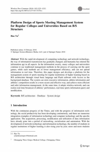 摘要 随着计算技术和网络技术的飞速发展,信息的传输方式也逐渐发生了变化,人类已经全面进入了信息时代。在信息社会,许多高校在开展运动会的过程中继续使用传统的管理方法,但这些方法管理效率较低,不能实时传播信息。因此,本文通过visual basic语言和Flash软件,以Access为后台数据库,设计并开发了一个基于B/S架构的普通高校运动会管理系统平台。该系统能够以更安全有效的方式存储管理人员信息、运动员信息和运动员比赛成绩,实现更高效、更安全的信息管理。同时,采用无线网络,实现运动员成绩的实时直播,实时体育信息查询和修改。