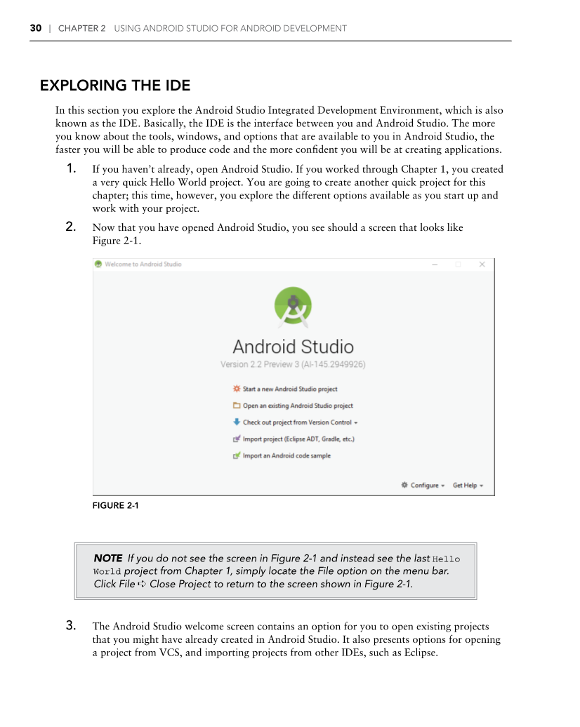 2. 现在已经打开了Android Studio, 你将看到如图2-1所示的用户界面。