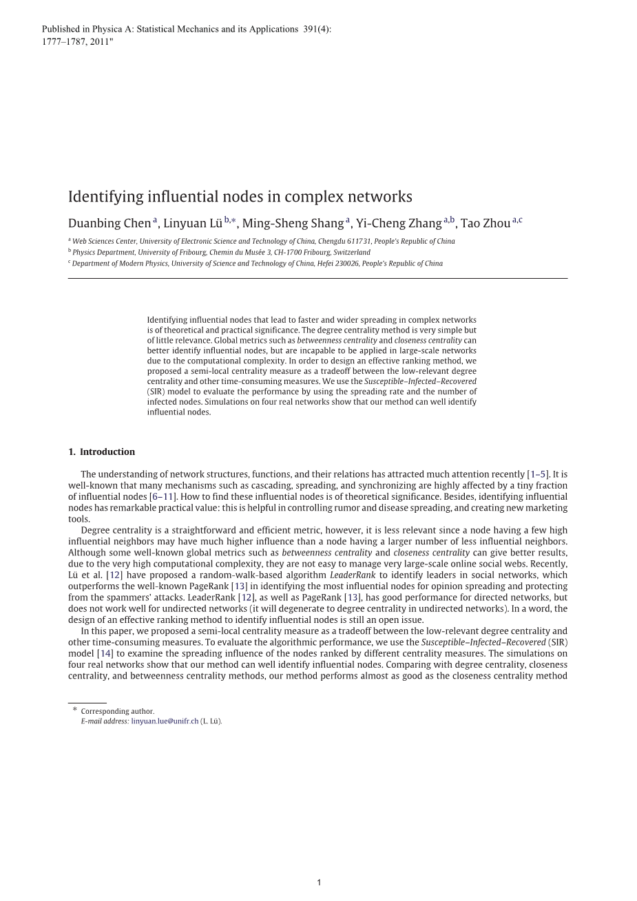 识别出在复杂网络中传播速度更快、传播范围更广的有影响的节点具有重要的理论和现实意义。度中心性算法非常简单,但相关性不大。而全局度量方法,如中间中心性和接近中心性,可以更好地识别有影响的节点,但由于计算的复杂性,无法应用于大规模网络中。为了设计一种有效的排序方法,我们提出了一种半局部中心性方法,作为低关联的度中心性性度量与其他耗时度量之间的权衡。我们用采用SIR模型,利用传播速率和受感染节点数来评价系统的性能。在四个实际网络上的仿真结果表明,该方法能够很好地识别有影响的节点。
