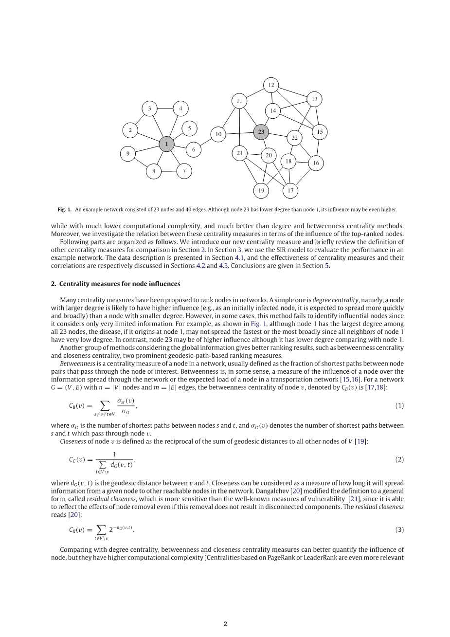 以下部分组织如下:我们介绍了我们的新中心度度量,并简要在第二节中总结了其他中心度量的定义作为比较.在第三节中,我们使用SIR模型来评估一个例子网络的性能。数据描述见4.1节,中心性度量的有效性及其相关关系分别在第4.2节和第4.3节中讨论。结论见第5节。
