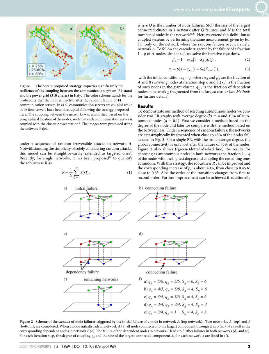 Buldyrev等人提出了一个渗流框架来研究两个耦合网络A和B,每个A节点通过双向链路与B节点耦合,这样当一个节点失效时,另一个节点也不能运行。删除一小部分A节点可能会触发多米诺骨牌效应,其中不但B中的对应部分发生故障,而且与两个网络的巨集群断开连接的所有节点也都失败。这导致失败的进一步级联,导致连接的突然崩溃,以不连续(一阶)渗流转变为特征。 Parshani等表明,通过降低耦合程度可以减轻破坏,但只有当节点的一个重要部分(asymp;0.4)解耦时,过渡才会从非连续变为连续。通过随机选择一小部分节点成为自治的,并因此独立于另一网络来减少耦合。例如,对于发电站与通信服务器之间的耦合,自治发电站具有替代的通信系统,当服务器发生故障并且自主服务器具有自己的能源电源时使用这些通信系统。我们提出一种基于程度和中心性的方法来识别这些自治节点,从而在连接性方面最大化系统的稳健性。我们证明,使用这种方案,临界耦合增加,即需要去耦以平滑过渡的节点的分数要小得多(接近于0.1而不是0.4)。对于不同的耦合网络,包括Erdős-Reacute;nyi图(ER),观察到显着的改进,由于它们的狭窄程度分布,鲁棒性的这种改进是意料之外的。为了证明我们的方法的优势,在图1中,我们将所提出的策略应用到意大利的真实耦合系统中,并且表明,通过仅保护四台服务器,鲁棒性得到显着改善(图中标题中的细节)