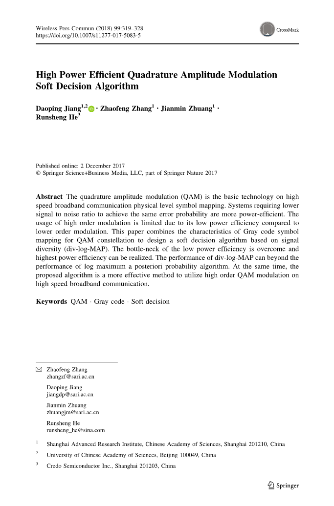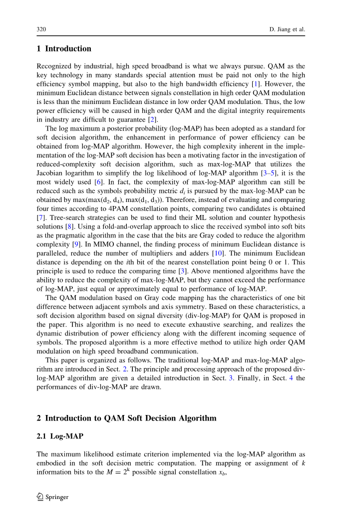 摘要 正交幅度调制(QAM)是高速宽带通信物理层符号映射的基础技术,而要求较低信噪比以达到相同错误率的系统更节能。由于与低阶调制相比,高阶调制的功率效率较低,所以高阶调制的使用受到限制。 本文结合QAM星座格雷码符号映射的特点,设计了一种基于信号分集(div-log-MAP)的软判决算法。低功耗效率的瓶颈被克服,并且可以实现最高的功率效率。div-log-MAP算法的性能可以超出对数最大后验概率算法的性能。同时,该算法是在高速宽带通信中利用高阶QAM调制的一种更为有效的方法。