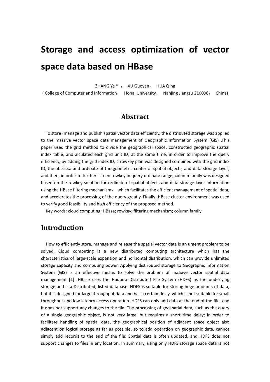 面对海量和复杂的空间矢量数据,如何对其进行高效存储、管理与发布,已成为一个迫切需要解决的问题。云计算是一种新的分布式计算架构,具有大规模扩展、水平分布的特性,可以提供无限的存储能力和计算能力。将分布式存储应用于地理信息系统( Geographic Information System,GIS) 领域是解决海量矢量空间数据管理问题的有效手段[1]。HBase 使用 Hadoop 的分布式文件系统( Hadoop Distributed File System, HDFS) 作为底层存储,是一个分布式、按列存储的数据库。 HDFS 适合于存储海量数据,但它设计是用于大吞吐量数据的,并且有一定的延时,不太适合吞吐量小且要求低延时的访问操作; HDFS 只能在文件的末尾添加数据,不支持在文件的任意位置进行修改。地理空间数据的处理,如单条地理对象 的查询,数据量不是很大,但要求查询延时短; 为了方便对空间数据的处理,地理位置相邻的空间对象尽可能在逻辑存储上也相邻,所以对地理数据执行添加操作时,不能简单地将记 录添加到文件末尾; 空间数据经常更新,而 HDFS 不支持文件在任意位置的修改。综上所述,仅使用 HDFS 存储空间数据并不合适。