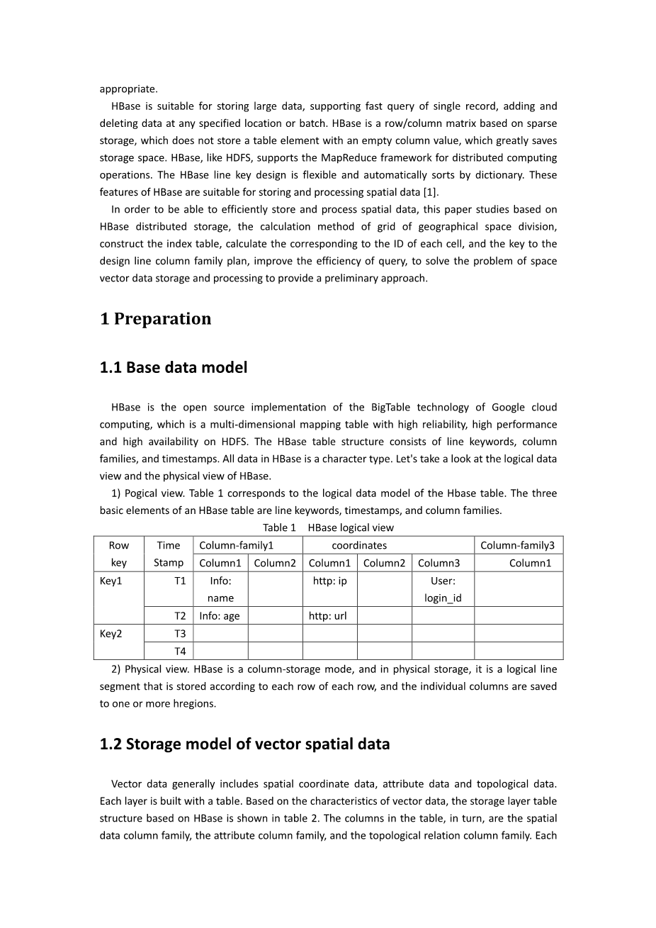 1) 逻辑视图。表1对应了 Hbase 表的逻辑数据模型。一个 HBase 表组成的 3个基本元素为行关键字、时间戳和列族。