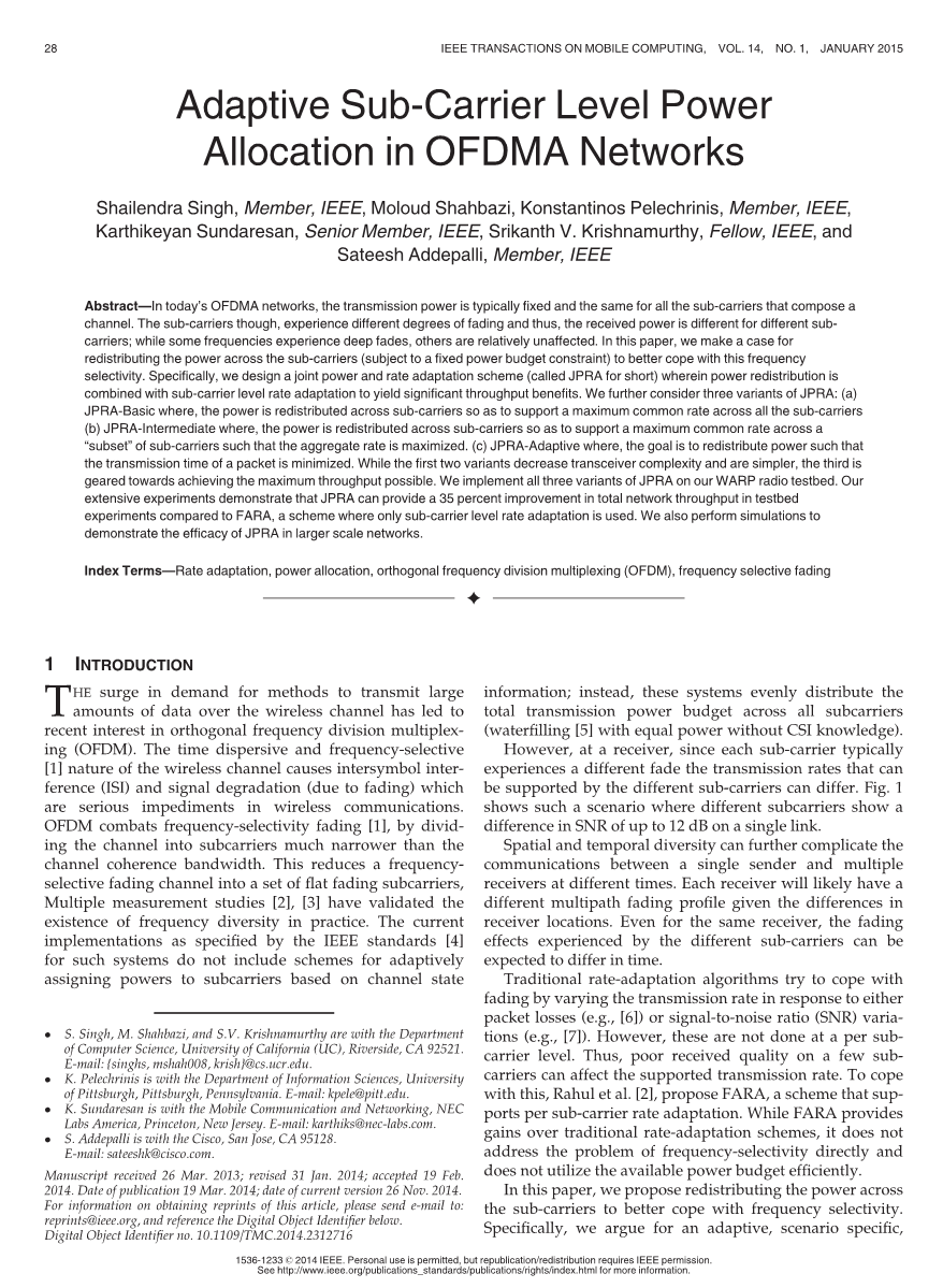 摘要 - 在当今的OFDMA网络中,传输功率通常是固定的,并且对于构成信道的所有子载波来说都是相同的。 然而,子载波经历不同 程度的衰落,因此,对于不同的子载波,接收功率是不同的; 而一些频率经历深度衰落,而另一些则相对不受影响。 在本文中,我 们提出了一个通过副载波重新分配功率的情况(受固定功率预算约束的限制),以更好地处理这种频率选择性。 具体而言,我们设 计了联合功率和速率适配方案(简称JPRA),其中功率再分配与子载波级速率适配相结合以产生显着的吞吐量益处。 我们进一步考 虑了JPRA的三种变体:(a)JPRA-Basic,其中功率在子载波上重新分配,以支持所有子载波上的最大共用速率