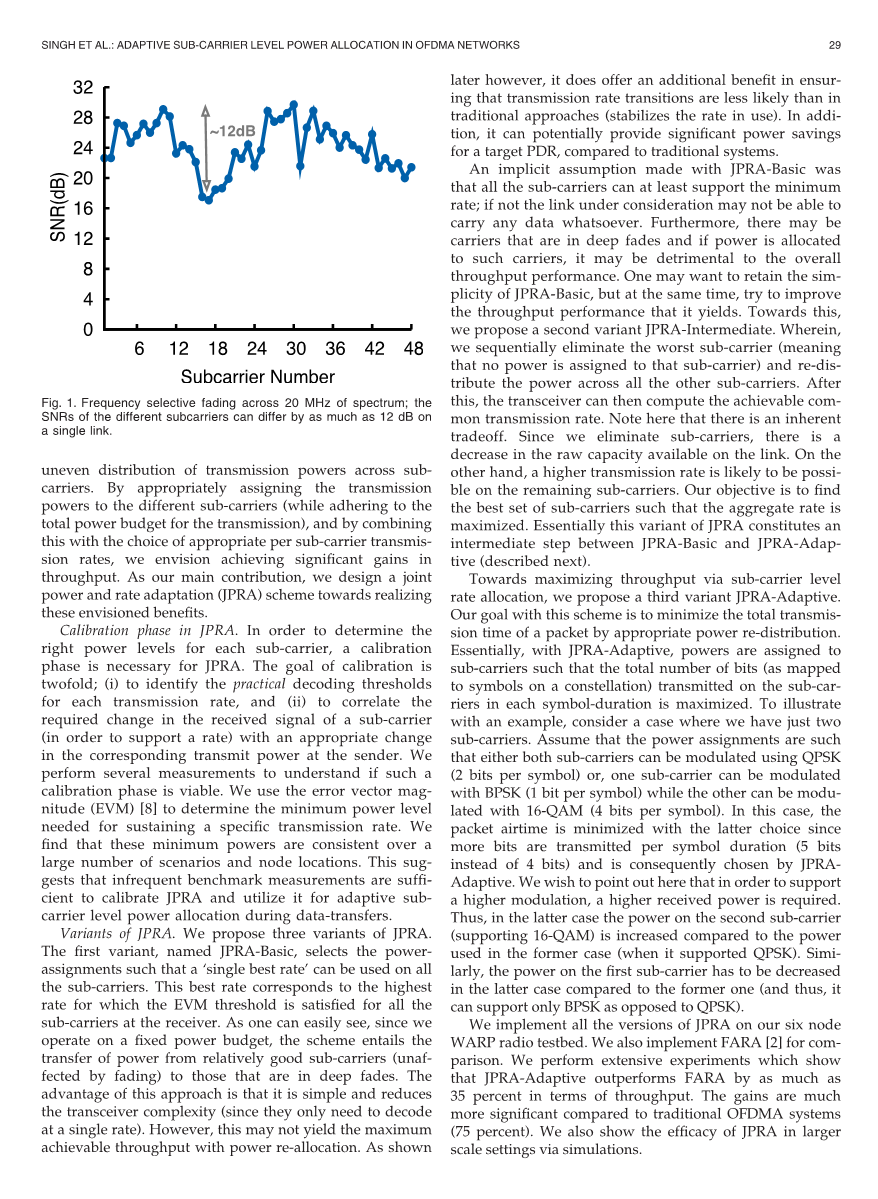 在本文中,我们建议通过副载波重新分配功率以更好地处理频率选择性。 具体而言,我们主张适应性的,情景特定的, 副载波间传输功率的不均匀分布。 通过适当地将传输功率分 配给不同的子载波(同时遵守传输的总功率预算),并且通 过将其与适当的每个子载波传输速率的选择相结合,我们设 想实现吞吐量的显着增益。 作为我们的主要贡献,我们设计 了一个联合功率和速率适应(JPRA)方案,以实现这些设想 的好处。
