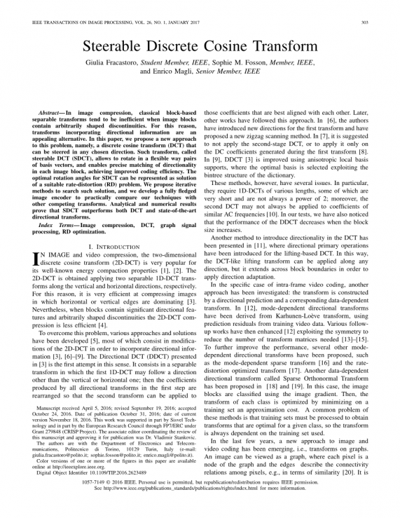 在图像压缩中, 当图像块包含任意形状的不连续性,经典的基于块的可分离变换往往效率低下。为此原因,包含方向信息的变换是吸引人的选择。在本文中,对于这个问题,我们提出了一种新方法——可以在任何选择的方向上操纵的离散余弦变换(DCT),即。这种变换,叫做可操纵的DCT(SDCT),允许以灵活的方式旋转对基矢量,并实现方向性的精确匹配,在每个图像块中,实现提高的编码效率。该SDCT的最佳旋转角度可以表示为解合适的率失真问题。我们建议迭代搜索此类解决方案的方法,并且我们开发了一个完全成熟的图像编码器实际上比较我们其他技术具有竞争变革。分析和数值结果证明SDCT优于DCT和最先进的技术的方向变换。
