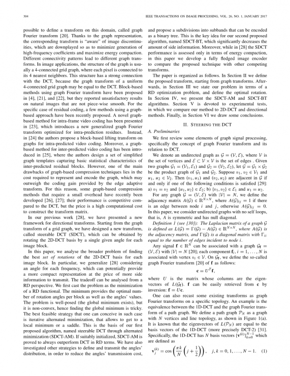 在我们之前的工作[28]中,我们已经提出了一个新的定向变换的框架。 从图表开始网格图的变换,我们设计了一个新的变换,称为可操纵DCTSDCT),可通过以下方式获得将2D-DCT基础旋转一个给定的角度图像块。