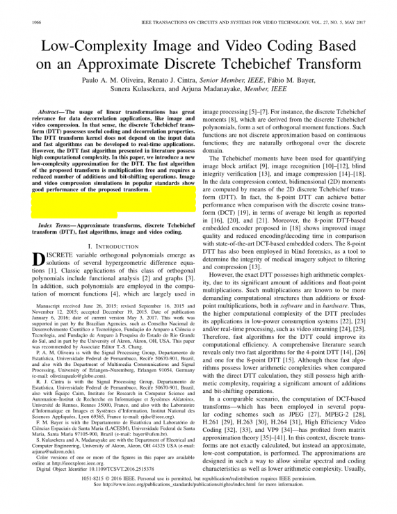 2015年6月26日收到的原稿;2015年9月16日和2015年11月12日修订;2015年12月19日接受。出版日期:2016年1月6日;现行版本日期:2017年5月3日。这项工作部分得到了巴西机构的支持,如Conselho Nacional de Desenvolvimento Encio e tecnol_gico、Funda_o do Amparo a ci_ncia e tecnologia和Funda_o de Amparo_pesquisa do Estado Rio Grande do Sul,部分得到了美国俄亥俄州阿克伦市阿克伦大学的支持。这篇论文由协会推荐。编者T.-S.Chang。 P.A.M.Oliveira与信号处理小组,巴西Recife 50670-901,Pernambuco联邦大学Estat_stica系,以及德国Erlangen–Nuremberg大学多媒体通信和信号处理系(邮箱:oliveirapaulo@globo.com)。 R.J.Cintra与信号处理小组、巴西累西腓50 670-901 Pernambuco联邦大学Deestat_stica系、计算机科学与自动化研究所Quipe Cairn以及法国Rennes 35000 Rennes大学Mes al_atoires研究所合作。以及法国里昂国家科学应用研究院信息实验室图像与系统信息中心(邮箱:rjdsc@ieee.org)。F.M.Bayer与巴西圣玛丽亚联邦大学圣玛丽亚分校(Universidade Federal de Santa Maria,Santa Maria 97105-900)的Estamito de Estat_stica和Laborat_rio de Ci_ncias Espaciais de Santa Maria(Lacesm)(电子邮件:bayer@ufsm.br)。 S.Kulasekera和A.Madanayake现就职于美国俄亥俄州阿克伦市阿克伦大学电气与计算机工程系,邮编:44325(邮箱:arjuna@uakron.edu)。 本文中一个或多个图形的颜色版本可在http://ieeexplore.ieee.org上在线获取。 数字对象标识符10.1109/tcsvt.2016.2515378 |