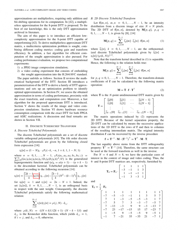 本文展开如下。第二节回顾了DTT的数学背景。第三节介绍了DTT的参数化,推导了一系列DTT近似,并建立了一个优化问题来识别最优近似。在第四节中,我们从编码性能、与精确变换的接近度和计算成本等方面评估得到的近似值。此外,还介绍了一种快速的近似DTT算法。第五节展示了图像和视频压缩模拟的结果。第六节显示了硬件资源消耗与准确的DTT的比较,包括FPGA和ASIC实现。讨论和最后评论见第七节。
