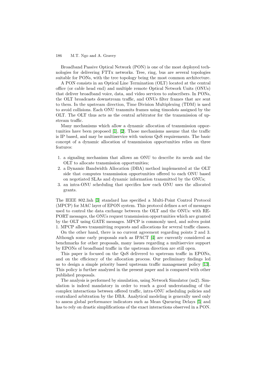 本文重点介绍EPON中向上行流量传送的QoS以及分配过程的效率。我们的初步研究成果是设计一个简单的基于优先级的上行流量管理策略[13]。本文将对本策略进行进一步分析,并与其他已发布的建议进行比较。使用网络模拟器(ns2)通过仿真进行分析。为了更好地理解comp,模拟确实是强制性的文章的其余部分组织如下。第2节提供相关文献的概述,并提供进一步讨论的背景知识第3节介绍了多服务DBA应该如何理想地表现。我们在动态分配策略方面的贡献在第4节中简要介绍。第5节指定了模拟的网络体系结构。第6节阐述了EPON向上行流量传输性能的分析,第7节总结了本文。