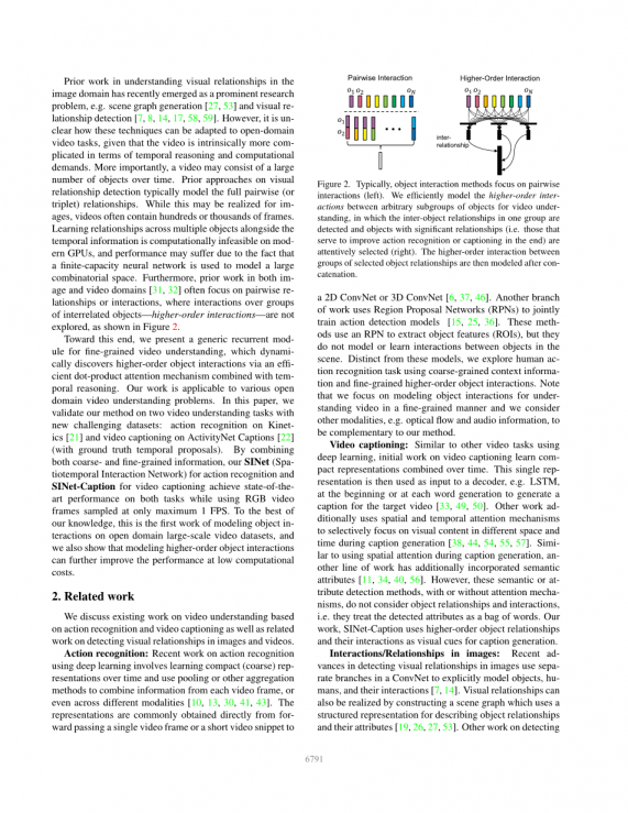 理解图像领域中的视觉关系的先前工作最近已成为一个突出的研究问题,例如,场景图生成[27,53]和视觉关系检测[7,8,14,17,58,59]。然而,目前尚不清楚这些技术如何适应开放域视频任务,因为视频在时间推理和计算需求方面本质上更复杂。更重要的是,视频可能包含随时间变化的大量相互关联的对象。关于视觉关系检测的现有方法通常模拟完整的成对(或三重)关系。虽然这可能是为了实现图像,但视频通常包含数百或数千个帧。在现代信息上学习多个对象旁边的关系在现代GPU上是不可行的,并且由于使用有限容量神经网络来模拟大的组合空间,性能可能会受到影响。此外,图像和视频领域的先前工作[31,32]通常关注成对关系或交互,其中不探讨相互关联对象组之间的相互作用 - 高阶交互 - 如图2所示。