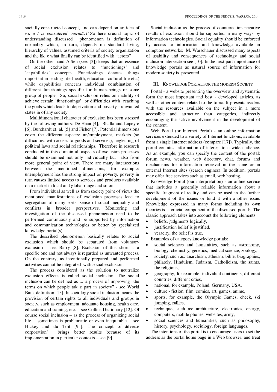 社会包容作为抵消社会排斥的负面影响的一种方法,应当被多种信息技术所支持。社会平等应该通过在计算机网络中获得的信息和知识来实施;M. Warschauer从多方面的讨论了可用性和技术与社会融合交汇的结果参见[10]。在下面一部分,作为现代社会的知识来源的知识门户的重要性将被展现出来。