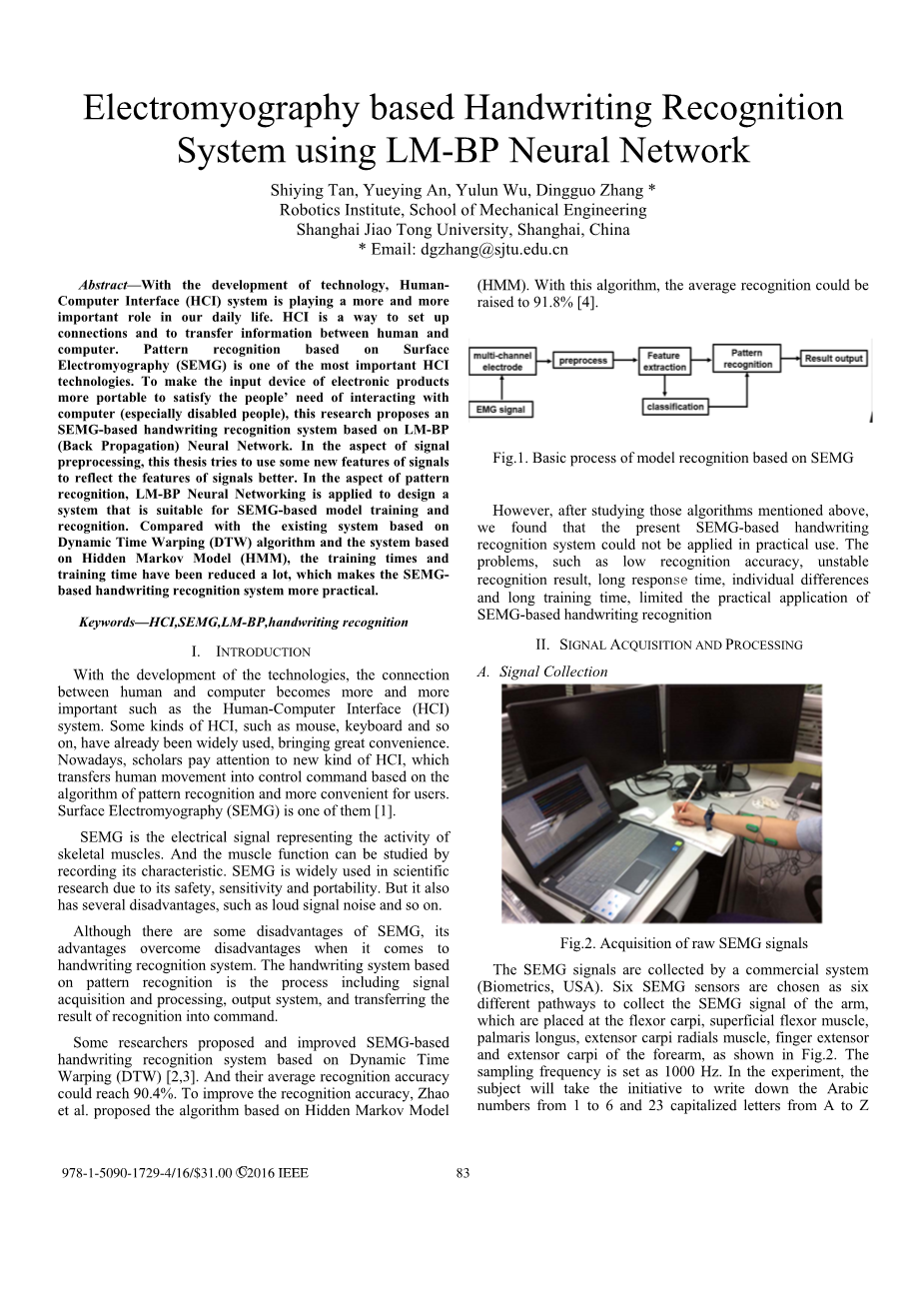 随着技术的发展,人机交互(HCI)系统正在我们的日常生活中扮演越来越重要的作用。HCI是一种在人和计算机之间建立连接和传输信息的方式。基于表面肌电图(SEMG)的模式识别是最重要的HCI技术之一。为了使输入电子折别更加便携,满足人们与计算机(尤其是残疾人)交互的需要,这项研究提出了一种基于LM-BP(反向传播)神经网络的肌电信号的手写识别系统。在信号预处理方面,本文尝试使用一些新特征来更好地反映信号的特点。在模式识别方面,LM-BP神经网络被应用于设计适合于基于SEMG的模型训练和识别的系统。与基于动态时间扭曲(DTW)算法的现有系统和基于隐马尔可夫模型(HMM)的系统相比,训练时间和训练时间减少了很多,这使得基于SEMG的手写识别系统更加实用。
