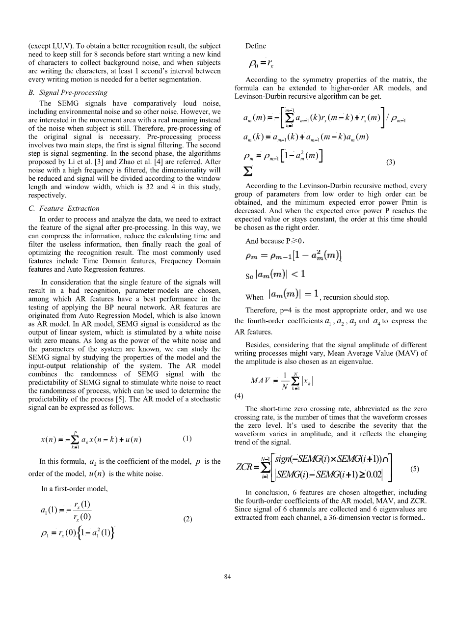 因此,p = 4是最适当的阶数,本文使用四阶系数,,和来表示AR特征。