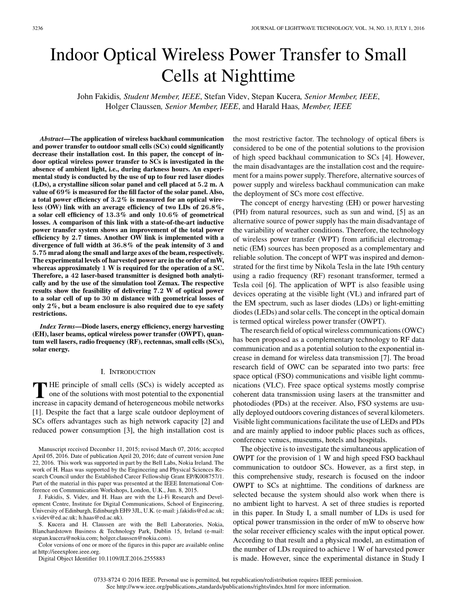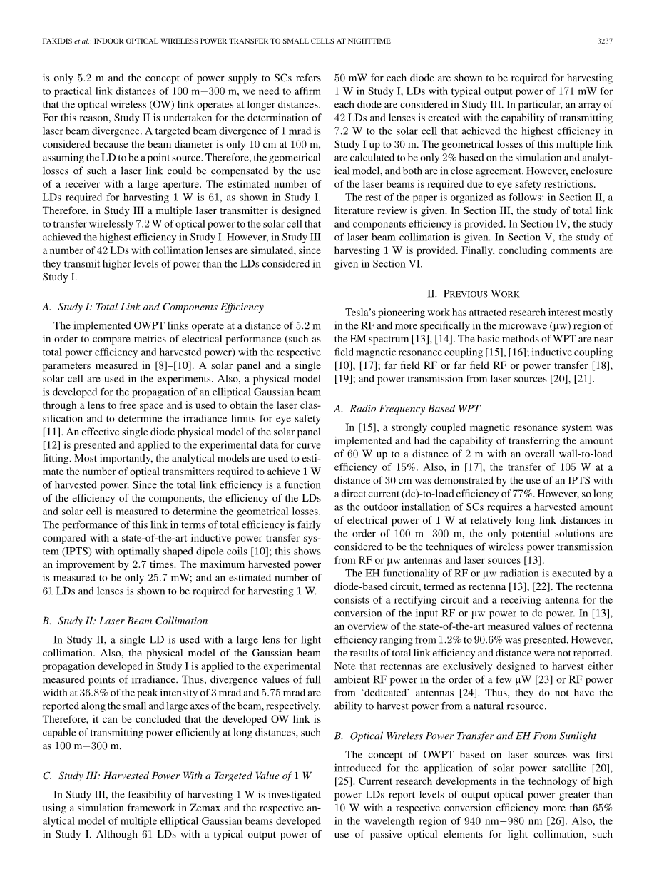 在[8]和[9]中研究了OWPT的独家室内应用。 在这些研究中,确保环境光可以忽略不计,因此在黑暗条件下调查OWPT对SCs的概念。在[8]中,通过使用高亮度白光LED,用于光准直的大型抛物面镜和放置在5米的a-Si太阳能电池板,创建了OW链路。最大测量链路效率和收获功率分别为0.1%和18.3 mW。 这一事实归因于面板的a-Si技术的显着的几何光学损耗和非常低的能量效率。光功率严重的几何损耗源自LED的朗伯辐射图,这是高效光准直的主要障碍。 因此,下一步是使用高度指令性的激光源和不同类型的太阳能电池板。