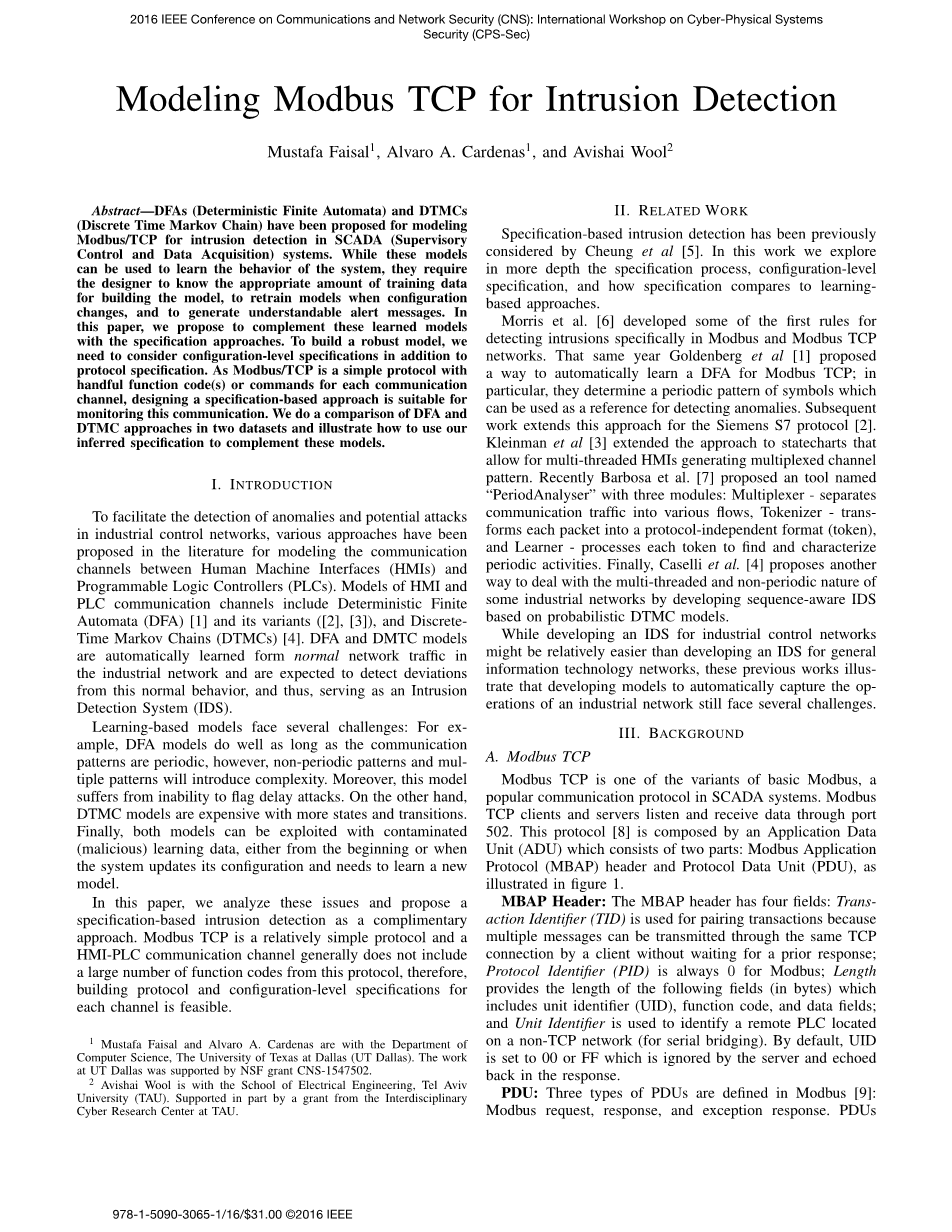 为了便于检测工业控制网络中的异常和潜在攻击,文献中提出了各种方法来建模人机接口(HMI)和可编程逻辑控制器(PLC)之间的通信通道。HMI和PLC通信渠道的模型包括确定性有限自动机(DFA)及其变体和离散时间马尔可夫链(DTMC)。DFA和DMTC模型自动从工业网络中的正常网络流量学习,并且预计会检测到与这种正常行为的偏差,从而作为入侵检测系统(IDS)。基于学习的模型面临着一系列的挑战:例如,只要通信模式是周期性的,DFA模型就会很好,然而,非周期性模式和多种模式将会引入复杂性。此外,这种模式还是无法标记延迟攻击。另一方面,DTMC模型是昂贵的,具有更多的状态和转换。最后,这两个模型都可以从受害(恶意)学习数据中被利用,无论是从一开始,还是系统更新其配置,并需要学习新的模型。在本文中,我们分析这些问题,并提出一种基于规范的入侵检测作为一种补充方法。Modbus TCP是一种相对简单的协议,HMI-PLC通信通道一般不包含大量来自此协议的功能码,因此,每个通道的构建协议和配置级规范都是可行的。