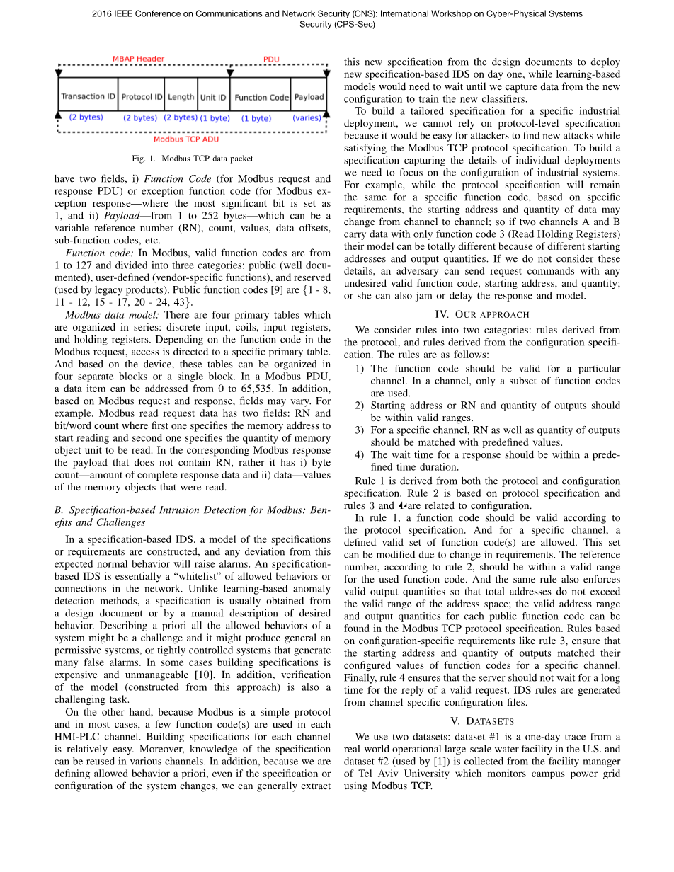 我们使用两个数据集:数据集#1是来自美国现实世界运营的大型水务设施的一天痕迹,数据集#2(1使用的))是从特拉维夫大学的设施经理收集的 使用Modbus TCP监控校园电网。在我们的数据集中,使用不同种类的功能代码,如表二所列。 注意(据我们所知),在网络跟踪捕获期间没有攻击。