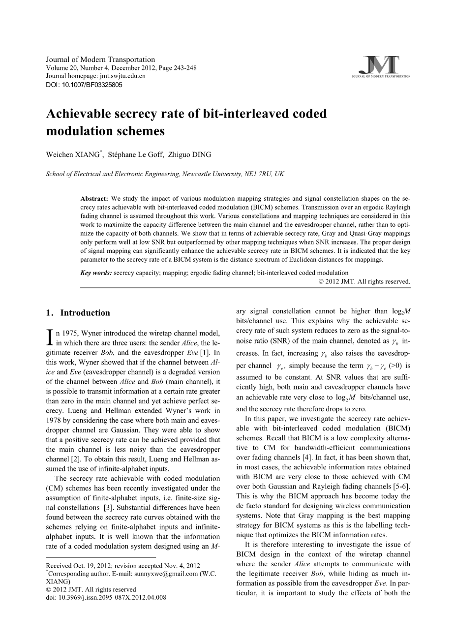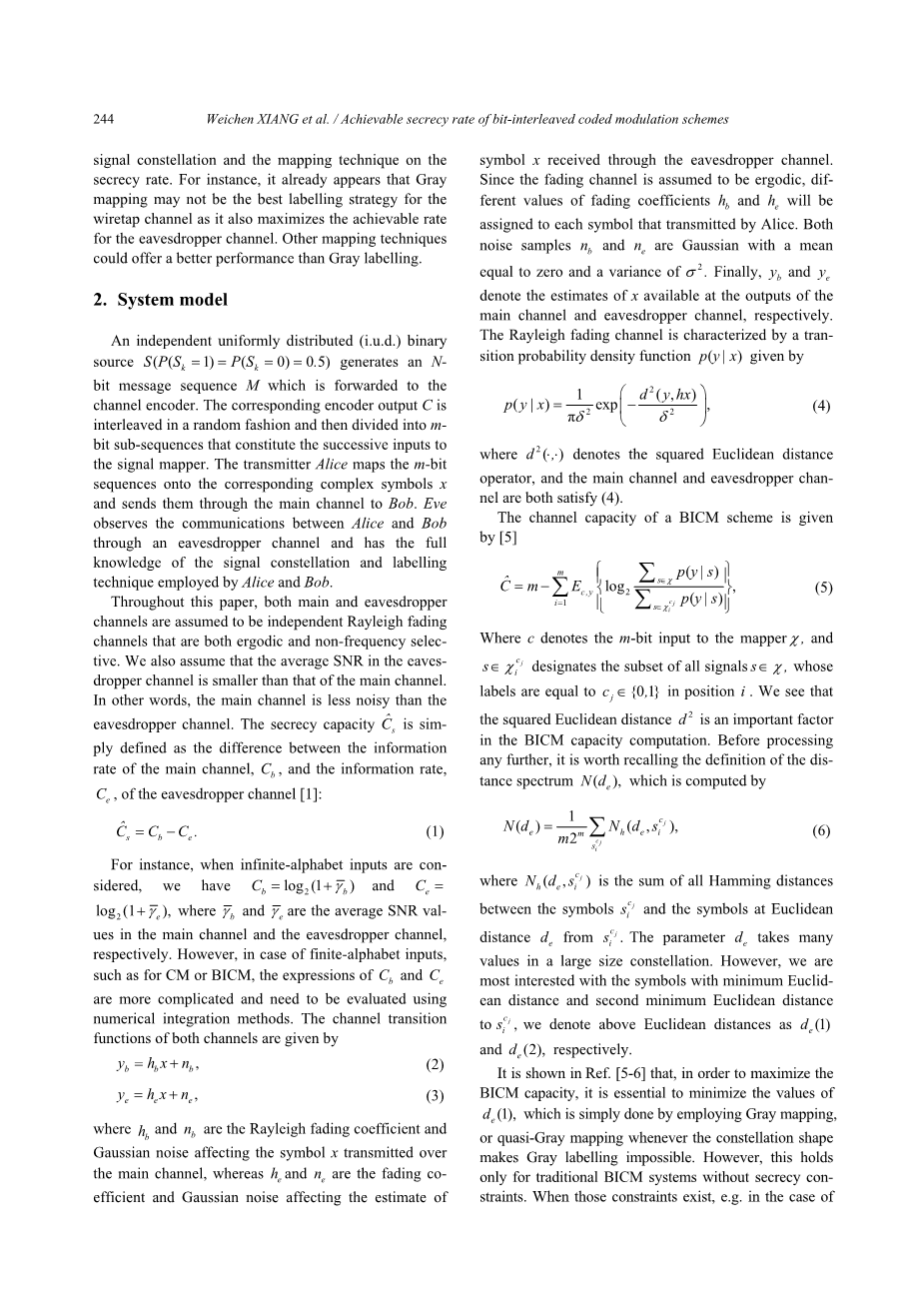 在1975年,Wyner介绍的窃听信道模型,其中有三个用户:发件人Alice,合法接收人Bob和窃听者Eve[1]。 在这项工作中,Wyner表明如果Alice之间的信道和Eve(窃听信道)是一个降级版本Alice和Bob(主信道)之间的信道,它能够以一定的速率更大的传输信息比主通道零更能达到完美的保密性。在1978年,Lueng和Hellman扩展Wyner的工作,假设主、窃听者的信道是高斯信道。他们能够证明一个正的保密速率可以实现,只要主通道比窃听者有较少噪声[2]。为了获得这种效果,Lueng和Hellman假设使用无限字符输入。保密率在编码调制中(CM)是可以实现的,输入是有限字符输入。即有限尺寸信号星座[3]。从获得的保密率曲线中可以看出有巨大差异,这种差异依赖与有限的字符输入还是无限字符输入。这是众所周知使用玛丽信号星座设计了一个编码调制系统的信息速率不能超过log2M比特/信道使用高。实际上,增加也引起了窃听者信道,仅仅是因为该术语(gt;0)是假定为常数。各种星座和映射技术被认为是在这工作最大限度的主要通道和窃听信道之间的能力差异,而不是优化两个通道的容量。我们表明,在实现保密率的情况下,灰色和准灰色的映射只有在低信噪比表现良好,当信噪比增加后,还是优于其他映射技术,正确的设计信号映射能显著提高BICM方案可达安全速率。它表明,关键参数的BICM系统保密速率为映射的欧氏距离的距离谱。在本文中,我们研究了比特交织编码调制(BICM)方案的能够达到的保密率。事实上,已经表明,在大多数情况下,所获得的可实现的信息速率与BICM非常接近那些与CM实现在高斯和瑞利衰落信道[5-6]。这就是为什么BICM方法已成为当今事实上的标准设计的无线通信系统。需要注意的是格雷映射是最好的映射战略BICM系统,因此,有趣的调查问题BICM设计在窃听信道的上下文中在发送端Alice试图与沟通合法的接收者Bob,而隐藏尽可能多的形成尽可能从窃听者Eve。在标准杆满足特殊,研究两者的作用是很重要的信号星座上的映射技术保密率。例如,它已经似乎格雷映射可能不是在最好的标记策略窃听信道,因为它也最大限度地提高可达到的速率对于窃听者通道。 其他映射技术可以提供比灰色标签有更好的表现。