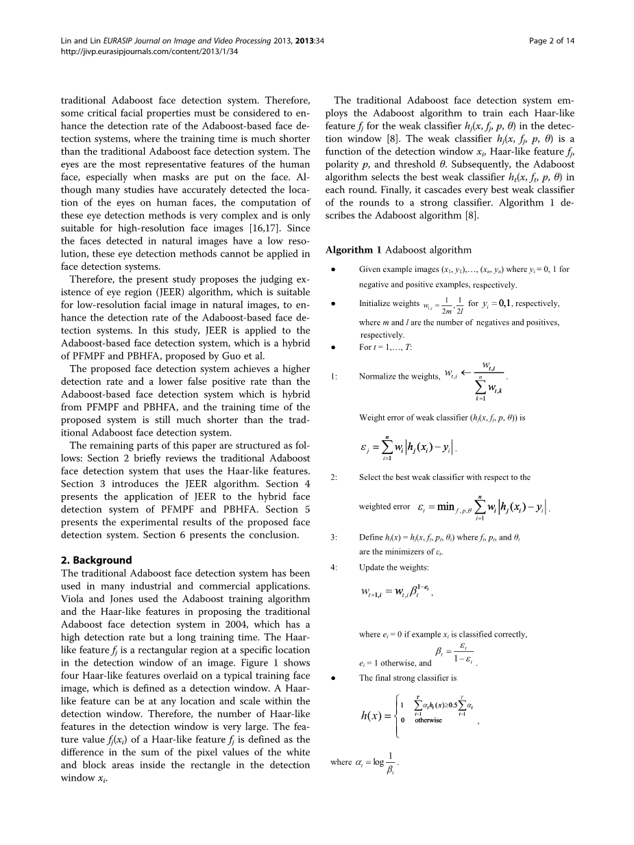 本文的其余部分结构如下:第2节简要回顾了使用哈尔式特征的传统Adaboost人脸检测系统。第3节介绍了JEER算法。 第4节介绍了JEER在PFMPF和PBHFA混合面部检测系统中的应用。第5节介绍了所提出的面部检测系统的实验结果。 第6节提出了结论。