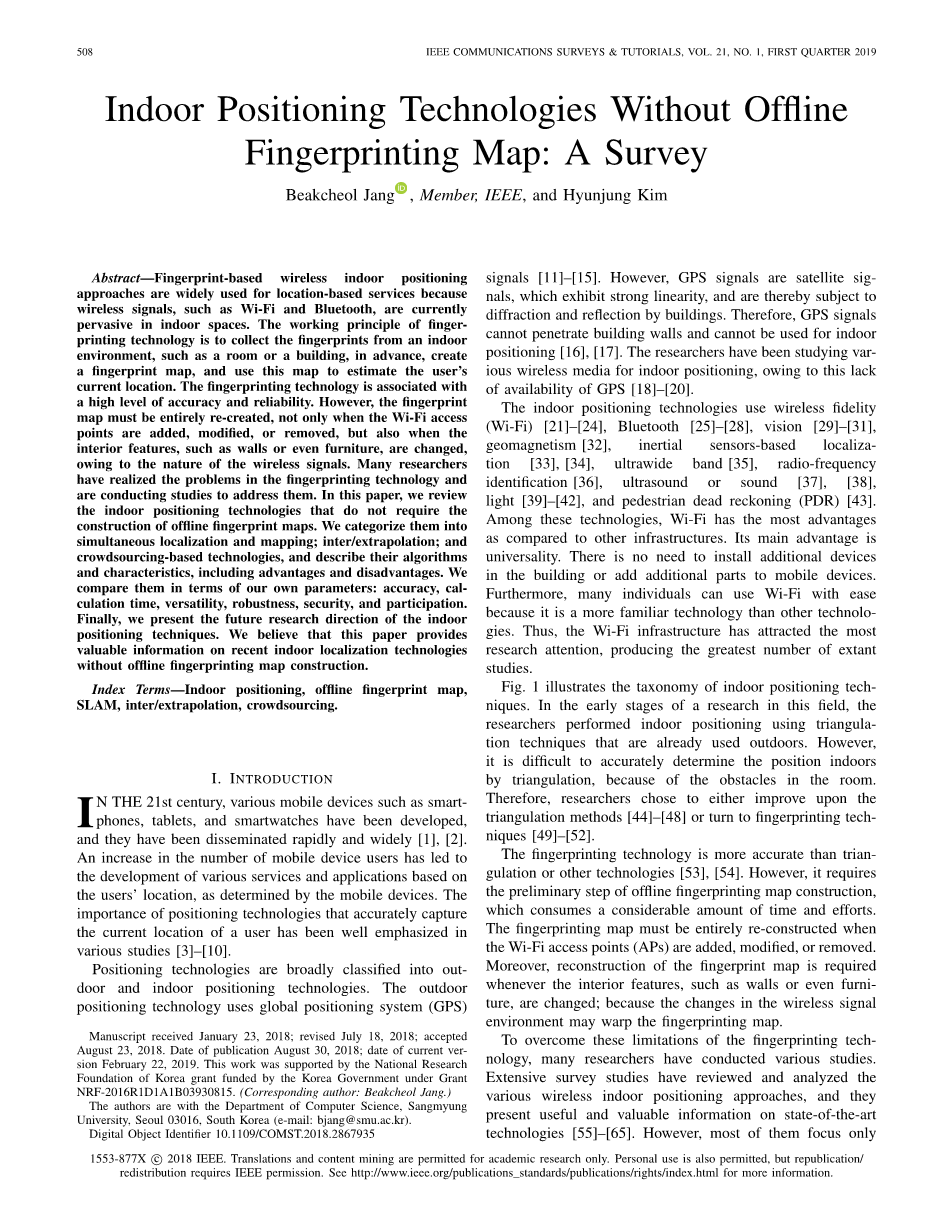 摘要—基于指纹的无线室内定位方法广泛用于基于位置的服务,因为无线信号(如无线网络和蓝牙)目前普遍存在于室内空间。指纹技术的工作原理是预先从室内环境如房间或建筑物中采集指纹,创建指纹地图,并使用该地图来估计用户的当前位置。指纹技术与高水平的准确性和可靠性相关联。但是,指纹图必须完全重新创建,不仅是在添加、修改或删除无线接入点时,而且在由于无线信号的性质而改变室内特征(如墙壁或甚至家具)时。许多研究人员已经意识到指纹技术中的问题,并正在进行研究来解决它们。在本文中,我们回顾了不需要构建离线指纹图的室内定位技术。我们将它们分为同步定位和映射;内插/外推和基于众包的技术,并描述它们的算法和特征,包括优点和缺点。我们根据自己的参数对它们进行比较:准确性、计算时间、通用性、健壮性、安全性和参与性。最后,提出了室内定位技术未来的研究方向。我们相信,本文提供了关于最近的室内定位技术的有价值的信息,而无需离线指纹图谱构建。