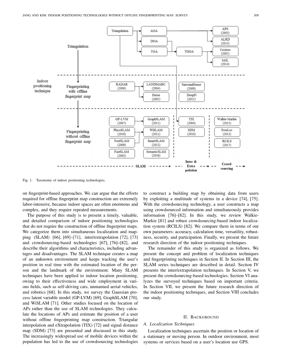 图1说明了室内定位技术的分类。在该领域研究的早期阶段,研究人员使用已经在室外使用的三角测量技术进行室内定位。然而,由于室内有障碍物,很难通过三角测量准确确定室内位置。因此,研究人员选择要么改进三角测量法[44]-[48],要么转向指纹技术[49]-[52]。