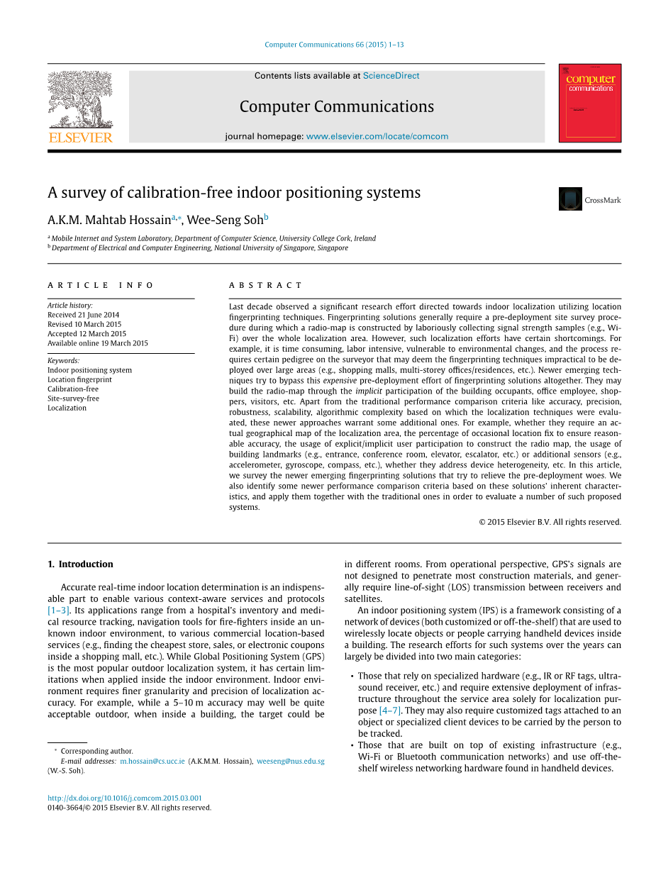 关键词:室内定位系统,位置指纹,免校准,免费现场调查,本地化。