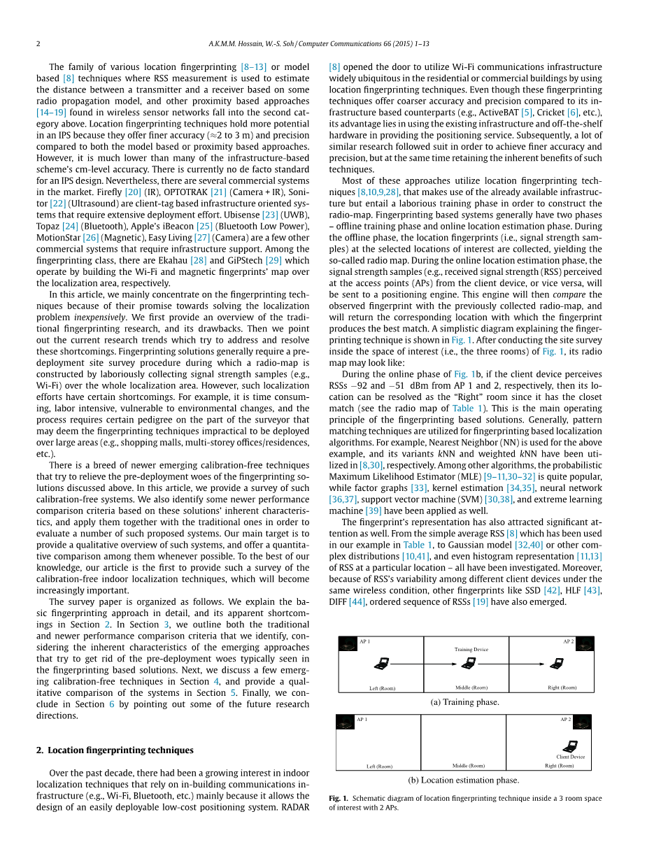 调查文件的组织方式如下。在本节中,我们将详细说明基本指纹识别方法及其明显的缺点。在2,3节中,我们概述了我们确定的传统和较新的性能比较标准,同时考虑了新兴方法的固有特征,这些方法试图摆脱通常在基于指纹的解决方案中看到的部署前麻烦。接下来,我们将在第4节中讨论一些新兴的免校准技术,并提供本节中系统的定性比较在第5节。最后,我们在第6节中指出一些未来的研究方向。