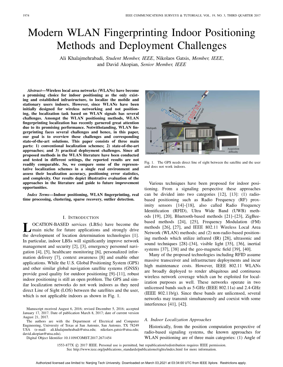 由于低成本部署,现有基础架构以及易于实施,WLAN室内定位已经引起了极大的关注。WLAN指纹识别方法由于在实际环境中已证明的性能而变得非常流行。由于室内传播是一种非常复杂的现象,会因多径和信号阻塞而失真,因此传