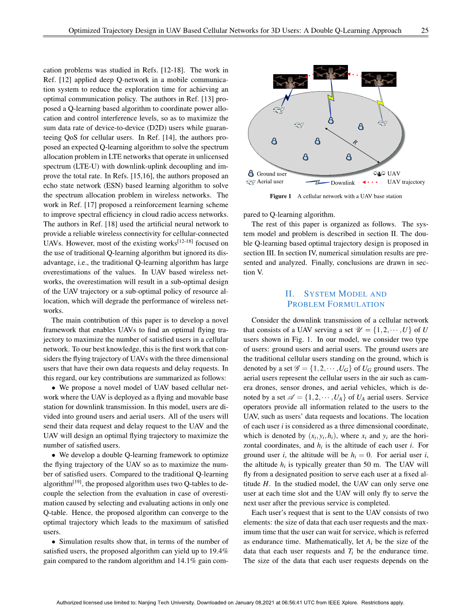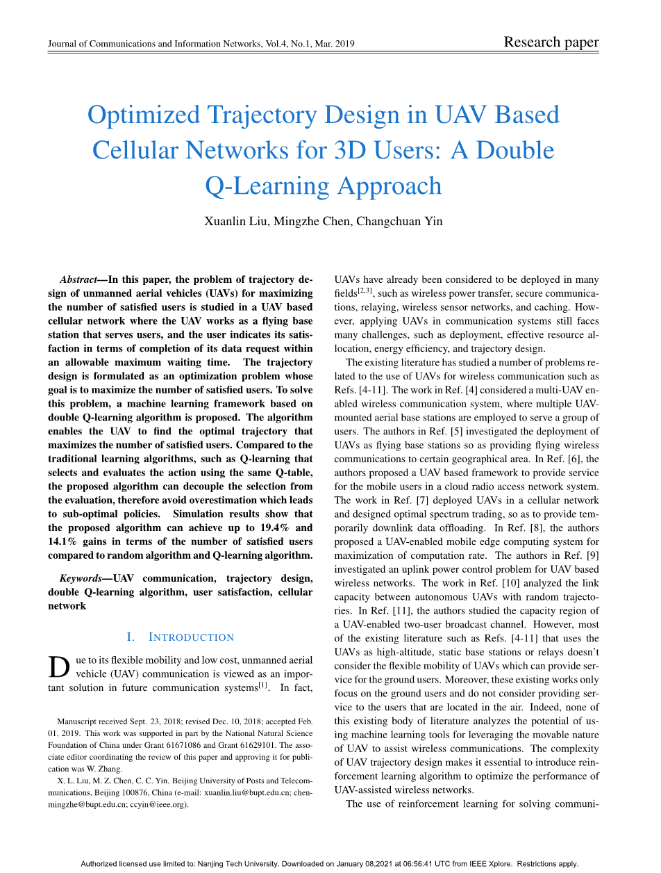 面向3D用户的无人机蜂窝网络轨迹优化方案 ——一种双Q学习法外文翻译资料