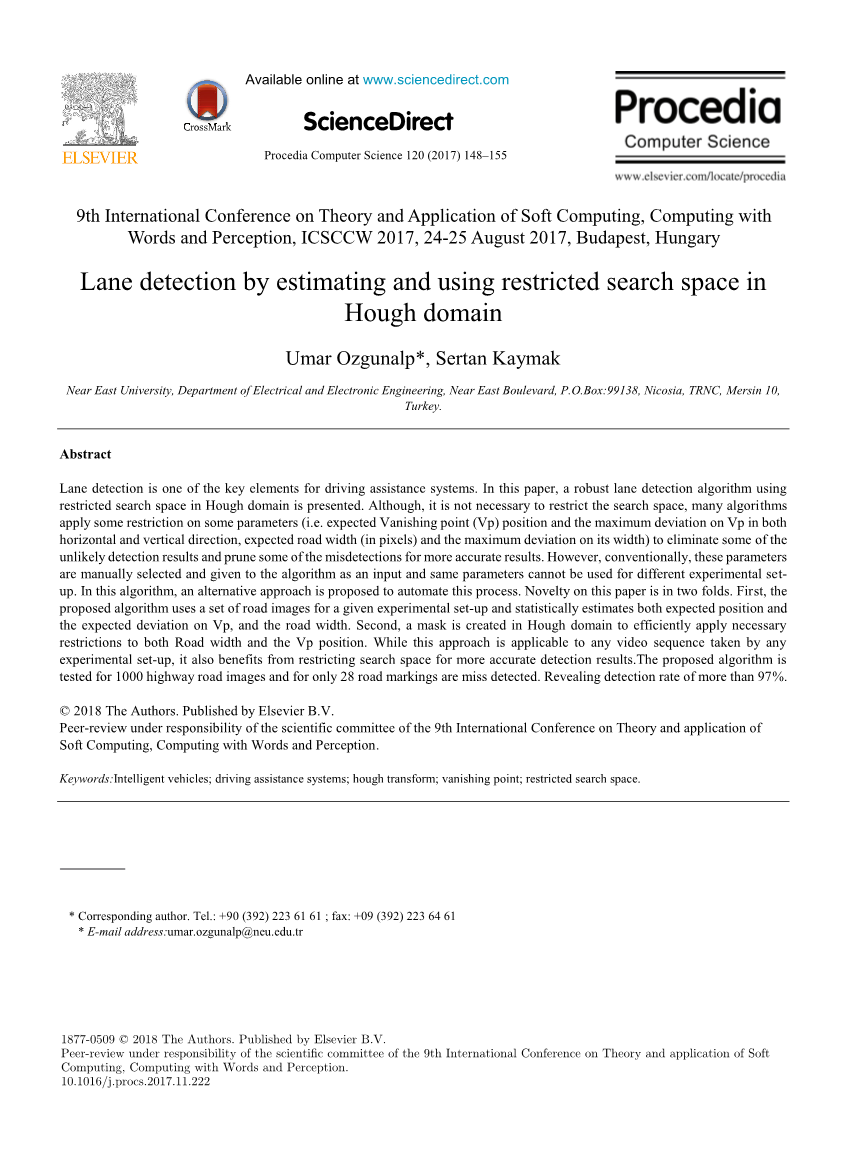 车道检测是辅助驾驶系统的关键技术之一。本文提出了一种基于Hough域受限搜索空间的鲁棒车道检测算法。虽然不需要限制搜索空间,但许多算法对某些参数(即期望消失点(Vp)的位置和Vp在水平和垂直垂直方向上的最大偏差、期望道路宽度(像素)和宽度上的最大偏差)施加一定的限制,以消除一些不太可能的检测结果,并删减一些错误检测以获得更准确的结果。然而,传统上,这些参数是手动选择并作为输入给算法的,相同的参数不能用于不同的实验装置。在这个算法中,我们提出了另一种方法来自动化这个过程。这篇论文的新颖之处有两个方面。首先,该算法在给定的实验环境下使用一组道路图像,统计估计期望位置和期望偏差,以及道路宽度。其次,在Hough域中创建一个遮罩,有效地对道路宽度和Vp位置施加必要的限制。虽然这种方法适用于任何实验装置拍摄的任何视频序列,但它也有利于限制搜索空间以实现更精确的检测结果。该算法对1000幅公路图像进行了测试,只有28幅道路标线漏检。显示检出率达97%以上。