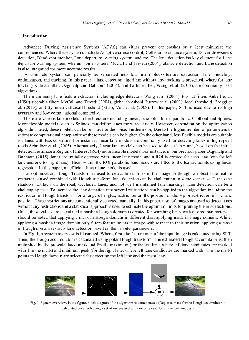 先进的驾驶辅助系统(ADAS)既可以防止车祸,也至少可以将后果降到最低。其中,这些系统包括自适应巡航控制、防撞系统、驾驶员睡意检测、盲点监控、车道偏离警告系统等。车道检测是车道偏离警告系统的关键要素,其中一些系统还集成了McCall和Trivedi(2004)、障碍物检测和车道检测以获得更准确的结果。