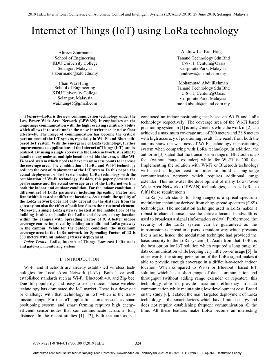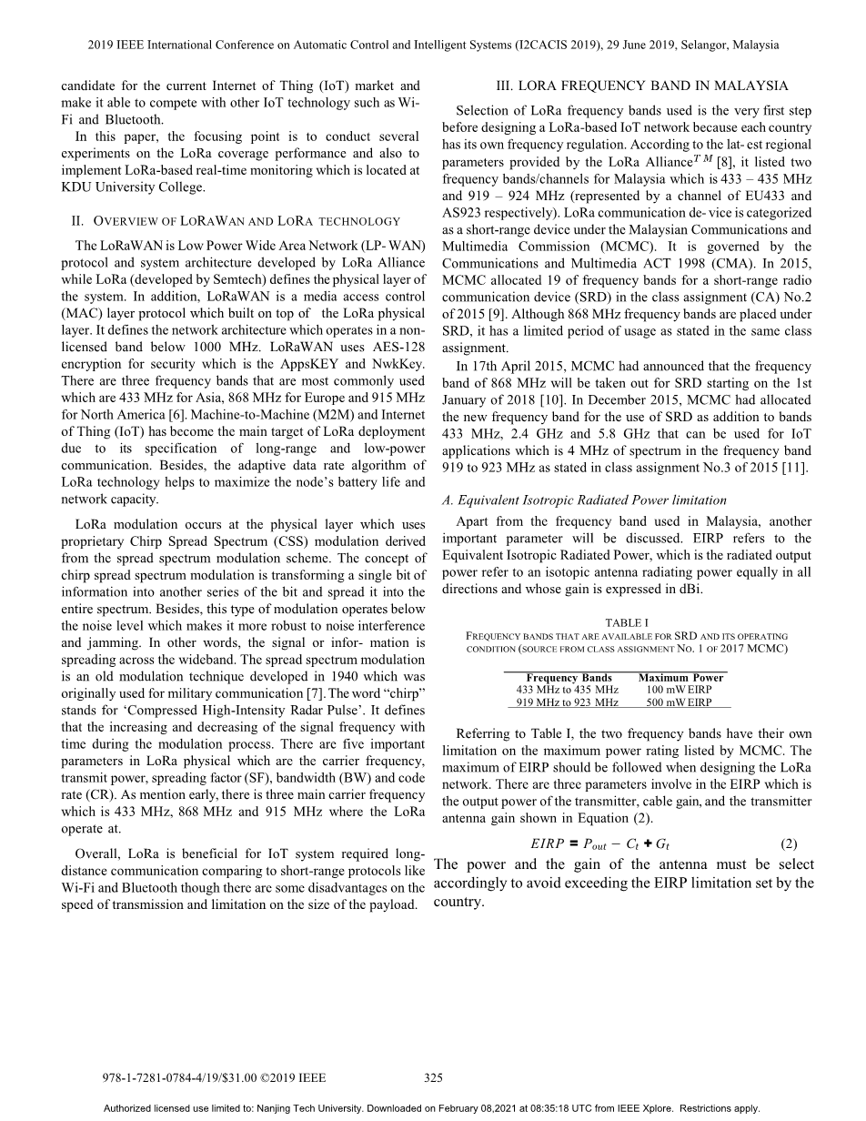 本文的重点是对LoRa的覆盖性能进行多项实验,并在KDU大学学院实现基于LoRa的实时监控。