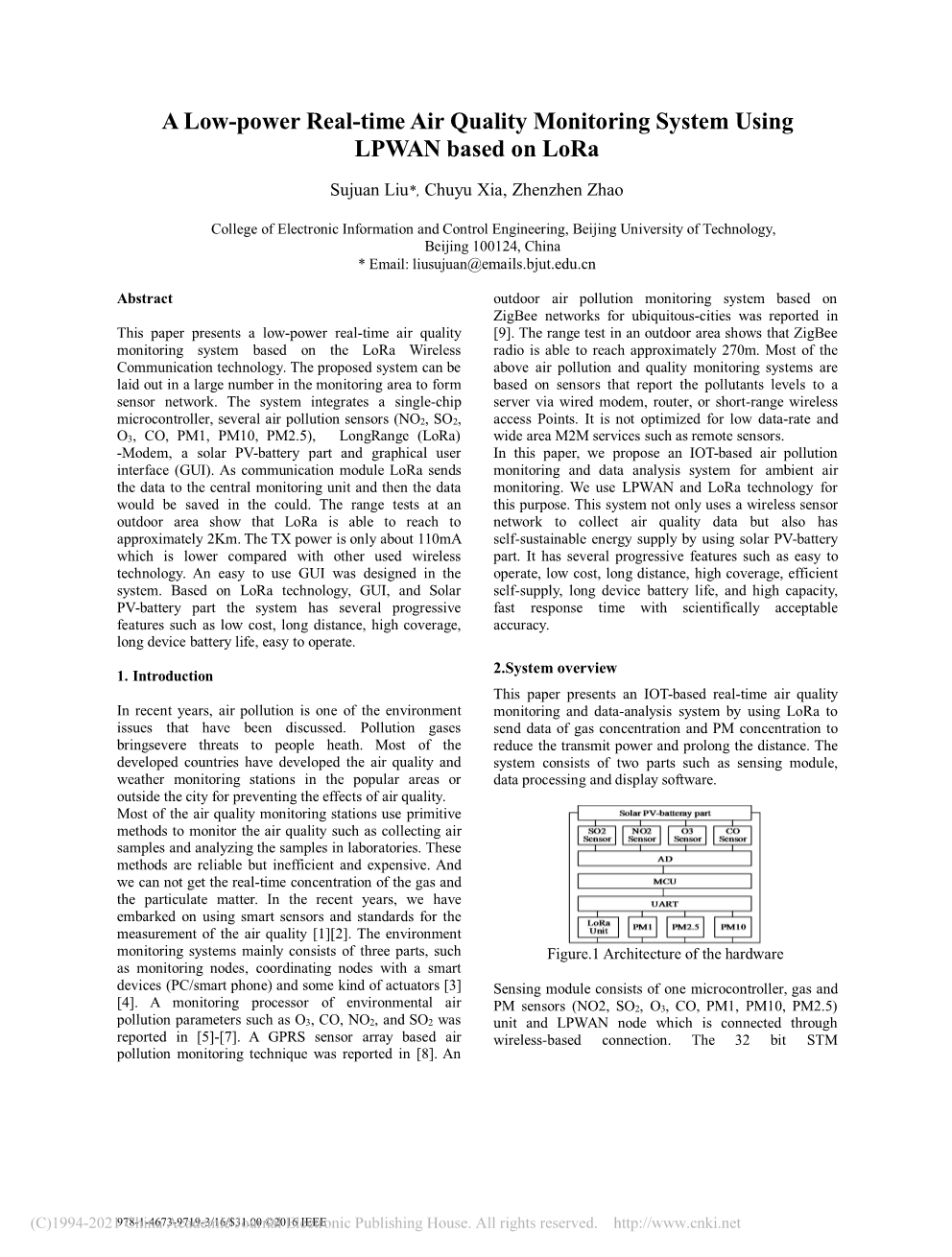 摘要:本文提出了一种基于LoRa无线通信技术的低功率实时空气质量监控系统。此系统可以在监控区域大量布置以形成传感器网络。该系统集成了单芯片微控制器,多个空气污染传感器(),远程(LoRa)调制解调器,太阳能光伏电池部件和图形用户介面(GUI)。当通讯模块LoRa发送数据传给中央监控单元时,数据将被保存在云端。在室外区域的范围测试结果显示LoRa范围可以达到约2公里。TX功率仅约110mA,比其他已使用的无线技术更低。系统中设计了一个更易于使用的GUI。基于LoRa技术,GUI和太阳能光伏电池部分系统有几个先进的特征,比如低成本,长距离,高覆盖率,设备电池寿命长,易于操作。