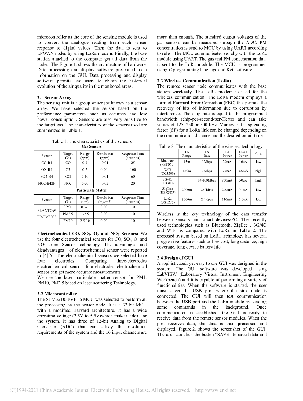 4. 结论:建议使用LoRa技术,气体和PM传感器作为系统的低成本解决方案。LoRa技术使此系统与其他无线技术相比有着出色的,远距离,低功耗的优势。我们使用的四种电气化学传感器使空气质量数据更稳定和准确。实验结果表明系统可以精确地监测和测量气体浓度和PM浓度。