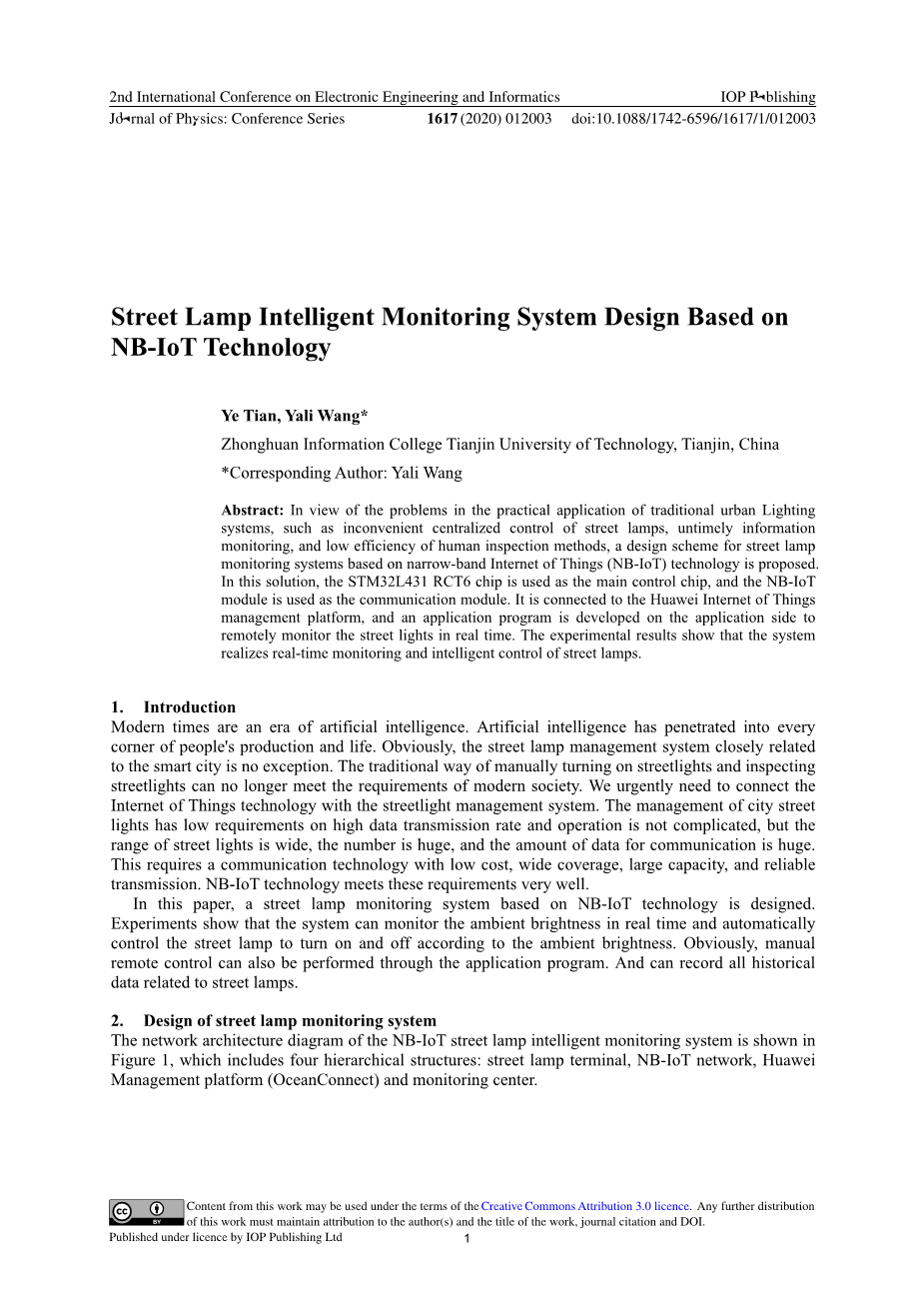 摘要:本论文针对传统城市照明系统在实际应用中存在的路灯集中控制不方便、信息监控不及时、人工检测方法效率低等问题,提出了一种基于窄带物联网技术的路灯监控系统的设计方案。该方案采用stm32l431rct6芯片作为主控芯片,NB-IoT模块作为通信模块。接入华为物联网管理平台,在应用端开发应用程序,对路灯进行远程实时监控。实验结果表明,该系统实现了路灯的实时监控和智能控制。