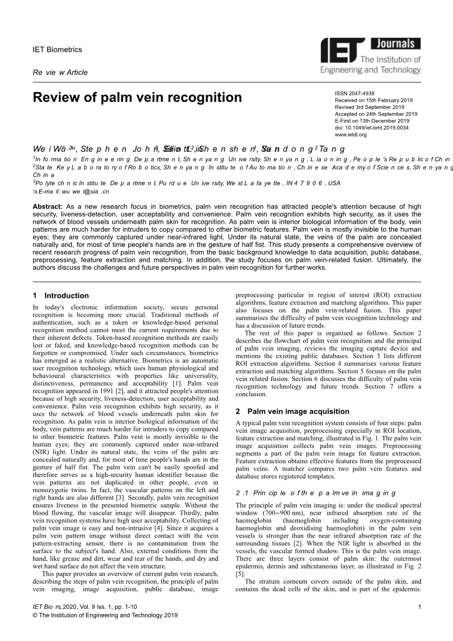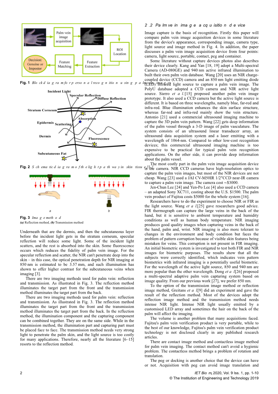 在当前的手掌静脉识别方法中,许多ROI定向方法将ROI定位在手掌的中心。一些文献是从掌纹识别中得出ROI的提取方法:文献[6]的方法源于文献[36]的方法,文献[8]提出的方法是文献[37]方法的衍生等。但这些ROI定位方法会引入三条掌纹形成假的掌静脉信息。预处理算法将正方形区域进行分割,以便对正方形区域进行特征提取,从而更易于处理平移变化,而圆形[38]和半椭圆形[39]区域可能更易于处理旋转变化。掌纹识别的一些文献[38, 39]将圆形或半椭圆形区域作为ROI。非接触式掌静脉识别可能值得尝试,但非接触式掌静脉的ROI定位仍然是一个挑战。 Jhinn等人[40]做了关于当用户的手的旋转很大并且旋转到特定角度时如何定位ROI的研究。为此,提出了一种新颖的旋转不变算法,称为之字形谷检测。