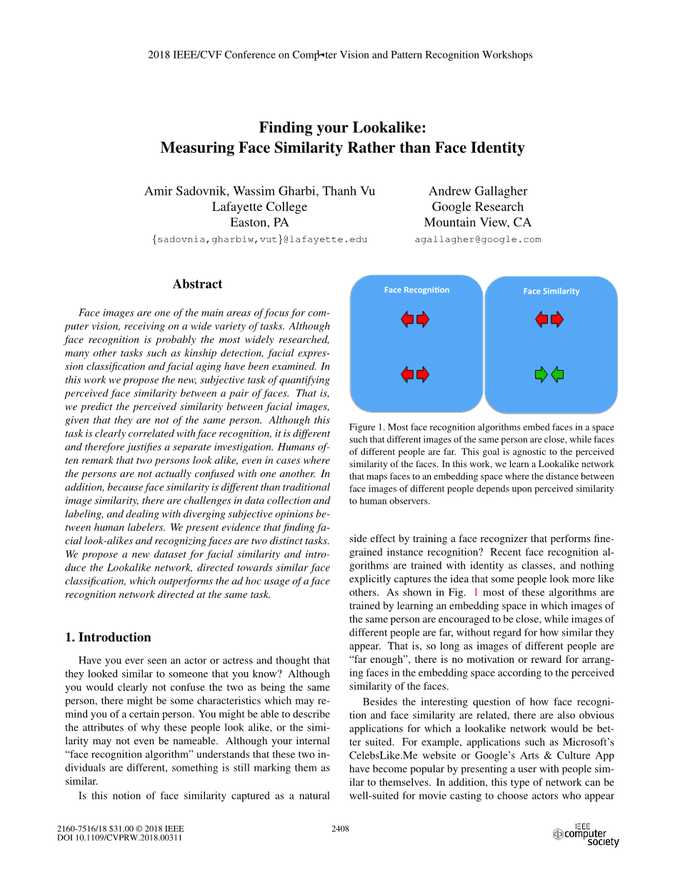 利用这种直觉,我们提出了我们认为是研究面部相似度作为独立任务的第一篇论文。首先,我们通过收集检查面部相似度和面部识别之间关系的数据集来证明这种直觉是正确的。然后,我们介绍类似的网络,该网络学习专门用于此任务的嵌入空间。最后,我们给出的结果表明,我们的lookalike网络成功地学习了如何测量人脸相似度,并且还能够推广到其他数据集。