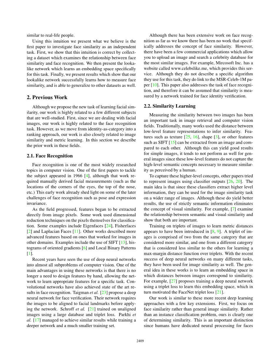 据我们所知,尽管在人脸识别方面进行了大量工作,但还没有专门针对人脸相似性概念的工作。但是,有一些商业应用程序允许您上传图像并在名人数据库中搜索最相似的图像。例如,Mircosoft 公司有一个名为www.celebslike.me的网站,它提供此服务。尽管他们没有描述用于此任务的特定算法,但他们确实链接到MSR-Celeb-lM论文[10]。本文还解决了人脸识别的任务,因此可以假设相似性是由训练用于人脸身份验证网络测量的。