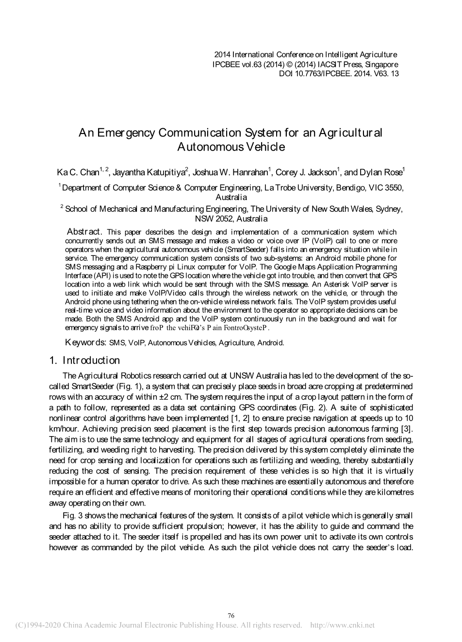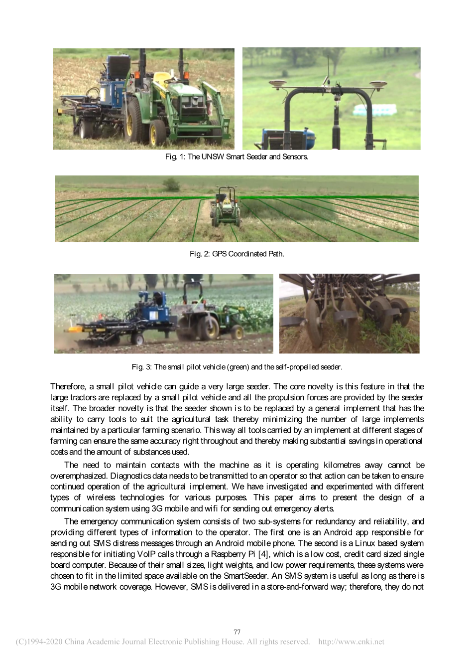 文中介绍了关于新南威尔士州智能播种机应急通信系统的设计与实现。我们都知道当机器在离人数公里外自主运行播种时,保持与机器可靠通信和及时接收紧急信息的必要性是十分重要的。尽管在目前看来智能播种机是一种高度可靠的无人驾驶车辆,不太可能发生的需要远程操作员立即响应的紧急情况下,但是一旦有意外状况发生,车载主控制器将自主触发紧急通信系统,通过短信和VoIP呼叫向操作员发送警报。文中所述紧急通信系统包括一个Android子系统,该子系统发送包含车辆目前GPS定位信息的短信警报;以及一个星号VoIP系统,该系统将语音和/或视