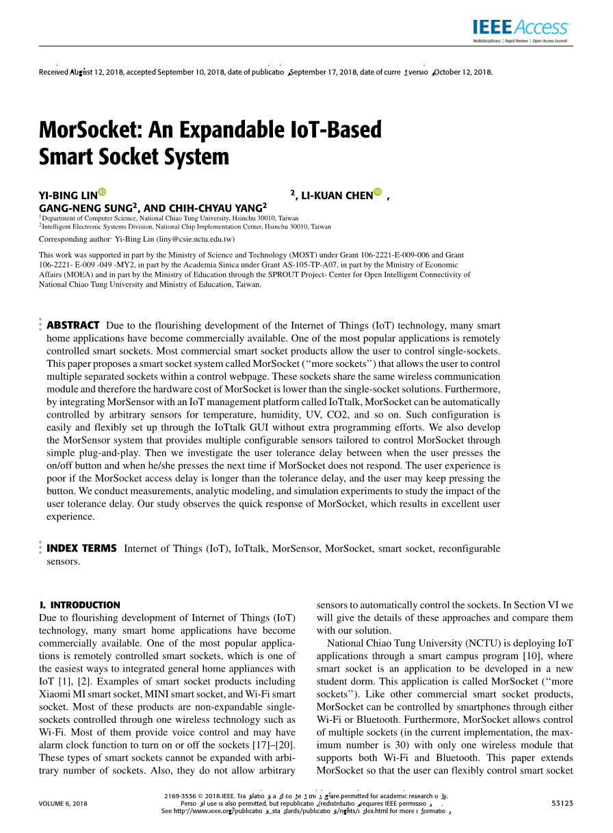 国立交通大学(NCTU)正在通过智能校园项目计划部署物联网应用程序,其中智能插座将是部署在新的学生宿舍中的应用。此应用称为MorSocket(“可扩展插座”)。与其他商用智能插座产品一样,可扩展智能插座可以由智能手机通过Wi-Fi或蓝牙进行控制。此外,可扩展智能插座允许仅使用一个同时支持Wi-Fi和蓝牙的无线模块来控制多个插槽(在当前实现中,最大数量为30)。本文扩展了可扩展智能插座以便用户可以灵活地通过使用传感器控制智能插座。例如,通过光传感器,可扩展智能插座会根据房间的光强自动打开或关闭。我们利用称为IoTtalk的物联网管理系统来实现上述目标。IoTtalk允许用户轻松灵活地调节任意传感器,以控制连接到可扩展智能插座的家用电器。