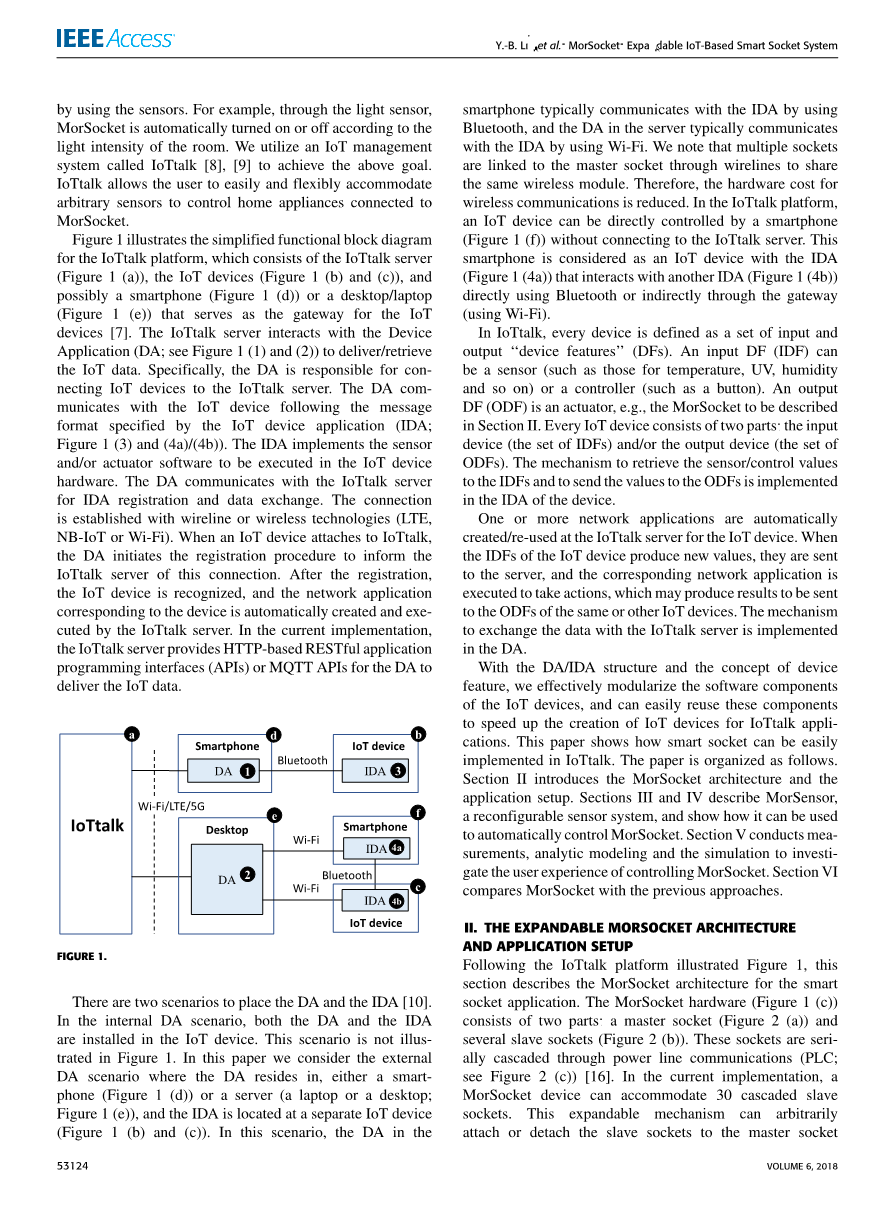借助DA / IDA结构和设备特征的概念,我们有效地模块化了物联网设备的软件组成,并且可以轻松地重用这些组件,从而加快IoTtalk应用程序的物联网设备的创建速度。本文展示了如何在IoTtalk中轻松实现智能插座。本文的结构如下。第二部分介绍了可扩展智能插座体系结构和应用程序设置。第三节和第四节介绍了可重新配置的传感器系统MorSensor,并展示了如何将其用于自动控制可扩展智能插座。第五节进行了测量,分析建模和仿真,以研究用户对可扩展智能插座的控制经验。第六节将可扩展智能插座与以前的方法进行了比较。