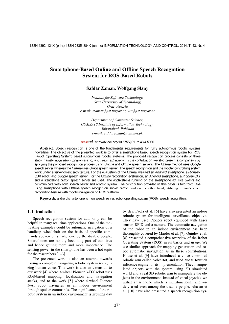 摘要:当今,语音识别是全自主机器人系统的基本要求之一。本文的目标是为基于机器人操作系统ROS的自动机器人系统提供一个基于智能手机的语音识别系统。语音识别的过程有三个步骤,即采集、预处理和结果提取。在研究中,我们也对在线和离线语音识别服务器进行了对比。在线方法使用谷歌语音服务器,离线方法使用Simon语音服务器。语音识别与机器人控制系统工作在服务器-客户端架构下。在对在线语音识别进行测试的过程中,我们使用了一台安卓智能手机,一个 Pioneer-3DX机器人以及谷歌语音服务器。对于离线语音识别的测试,我们使用了一台安卓智能手机,一个Pioneer-3AT机器人以及一个独立的Simon语音服务器。在智能手机上运行的应用作为客户端,与语音服务器和机器人系统进行通信。本文的研究有两方面:一方面使用离线语音识别服务器Simon和智能手机,另一方面,在ROS平台上的机器人导航中利用Simon语音识别功能。