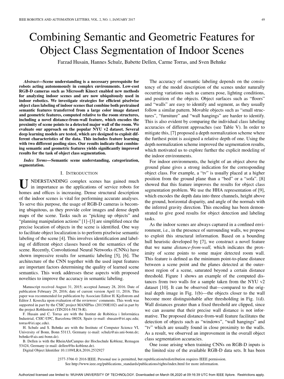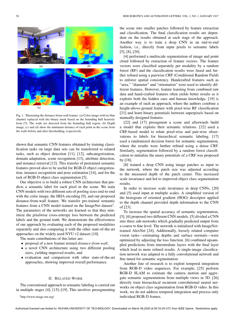 摘要场景理解是机器人在复杂环境中自主行动的必要前提。像微软Kinect这样的低成本RGB-D相机为分析室内场景提供了新的方法,现在广泛应用于室内机器人技术中。我们研究了有效的室内场景像素级对象标记策略,该策略结合了从大型彩色图像数据集中传输的预训练语义特征和相对于房间结构计算的几何特征,包括到墙的新距离特征,它编码场景点与检测到的房间主墙的接近程度。我们在流行的纽约大学v2数据集上评估我们的方法。测试了几种深度学习模型,这些模型旨在利用数据的不同特征。这包括两种不同池大小的特性学习。我们的结果表明,结合语义和几何特征可以显著提高对象类分割的效果。