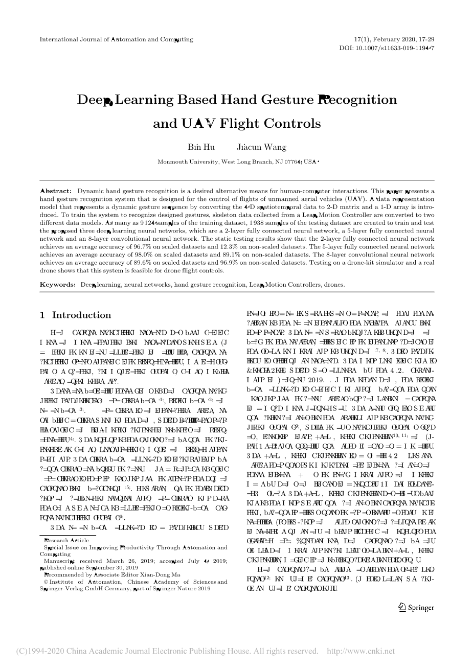 摘要:动态手势识别是一种理想的人机交互替代手段。介绍了一种用于无人机飞行控制的手势识别系统。介绍了一种将4维时空数据转换为2维矩阵和1维数组来表示动态手势序列的数据表示模型。为了训练系统识别设计的手势,从Leap Motion控制器收集的骨架数据被转换成两种不同的数据模型。为了训练和测试所提出的三种深度学习神经网络,分别建立了多达9124个训练数据集样本和1938个测试数据集样本。这三种深度学习神经网络分别是2层全连接神经网络、5层全连接神经网络和8层卷积神经网络。静态测试结果表明,两层全连通神经网络的平均精度为缩放数据集的96.7%和非缩放数据集的12.3%。5层全连通神经网络的平均精度为缩放数据集的98.0%和非缩放数据的89.1%。8层卷积神经网络的平均准确率达到了缩放数据集的89.6%和非缩放数据集的96.9%。在无人机模拟器和真实无人机上的测试表明,该系统对无人机飞行控制是可行的。