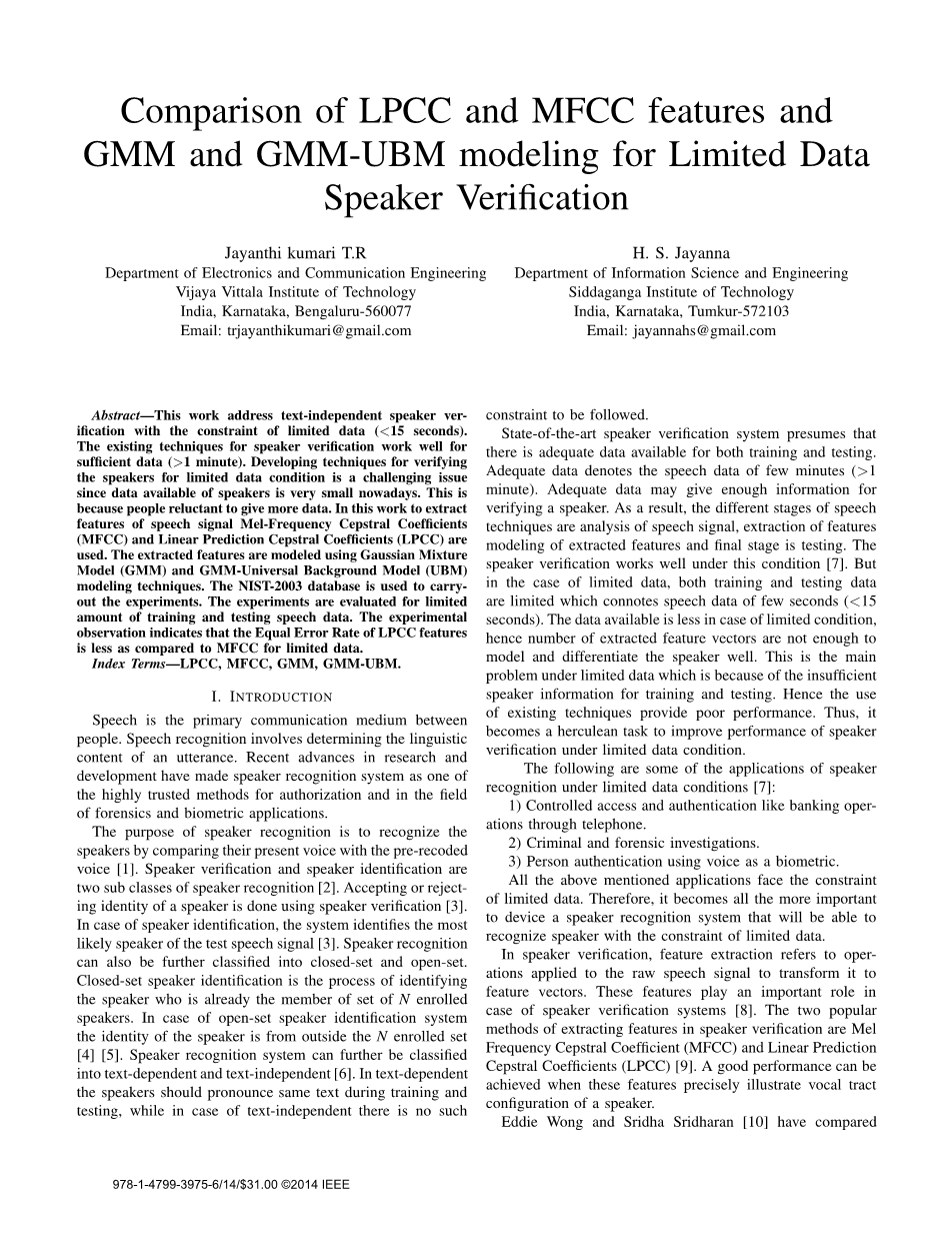 最先进的说话人验证系统假设有足够的数据可用于培训和测试。足够的数据表示几分钟(gt;1分钟)的语音数据。充分的数据可以提供足够的信息来验证说话人。因此,语音技术的不同阶段是语音信号的分析、特征提取的提取、特征提取的建模以及最后阶段的测试。在有足够数据的情况下,说话人验证工作得很好。但在数据有限的情况下,训练和测试数据都是有限的,这意味着几秒钟的语音数据(lt;15秒)。在有限的条件下,可用的数据较少,因此提取的特征向量数量不足以很好地对说话人进行建模和区分。说话人培训和测试信息不足是在数据有限的情况下的主要问题,这给现有技术的使用带来了很大的不便。因此,在有限的数据条件下提高说话人验证的性能成为一项艰巨的任务。