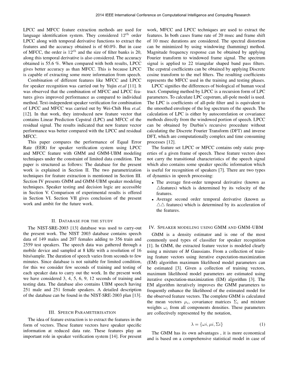 本文比较了在有限数据条件下,LPCC和MFCC特征与GMM和GMM-UBM建模技术在说话人验证系统中的等错误率(EER)性能。本文的结构如下:第二节介绍了本工作的数据库,第三节介绍了特征提取的两种参数化技术,第四节介绍了GMM和GMM-UBM说话人建模技术,第五节介绍了说话人测试和决策逻辑,第六节给出了实验结果的比较,第七节总结了目前的工作和今后工作的范围。