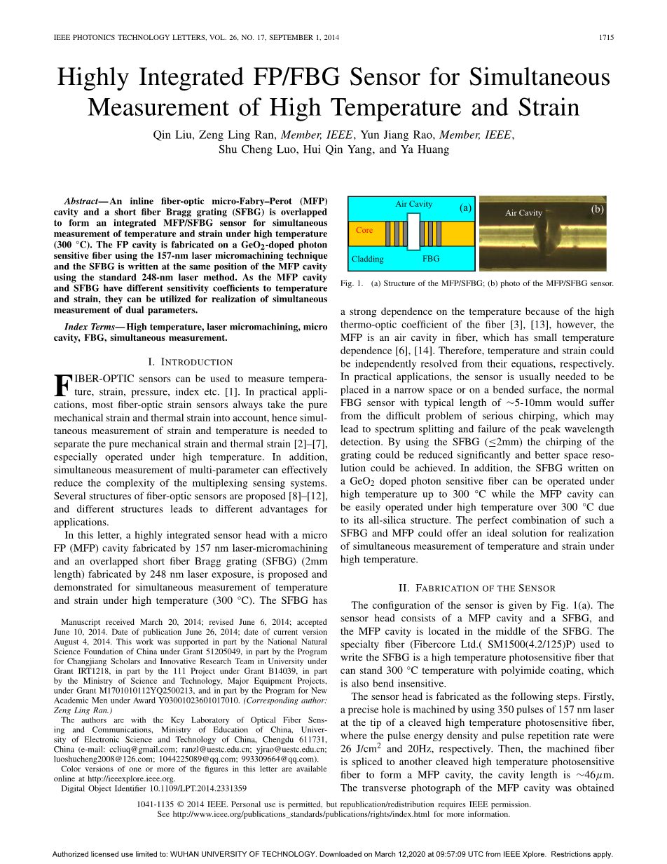 在本文中,我们提出并证明了一个高度集成的传感器在高温条件下(300°C)可以同时测量温度和应变,该传感器由157nm激光微加工制造的MFP谐振腔和248nm激光加工的SFBG(2mm)级联而成。由于光纤的热光系数高,SFBG对温度的依赖性强,然而,MFP是光纤中的一个谐振腔,它对温度的依赖性很低。因此,温度和应变可以从他们的方程中分别独立地解出来。在实际的应用中,通常需要将传感器放在狭窄的空间或弯曲的表面上。典型长度为5-10mm的普通FBG传感器会遇到严重的啁啾效应问题,这可能会导致光谱分散,且导致峰值波长测量失败。通过使用SFBG(le;2mm),可以显著降低光栅的啁啾,获得更好的空间分辨率。此外,刻印在GeO2光子敏感光纤上的SFBG可以在高达300℃高温的条件下工作,而MFP由于是全硅结构,它也可以很轻松地在高温下工作。SFBG和MFP的完美结合为高温下温度和应变的同时测量提供了很好的解决方案。