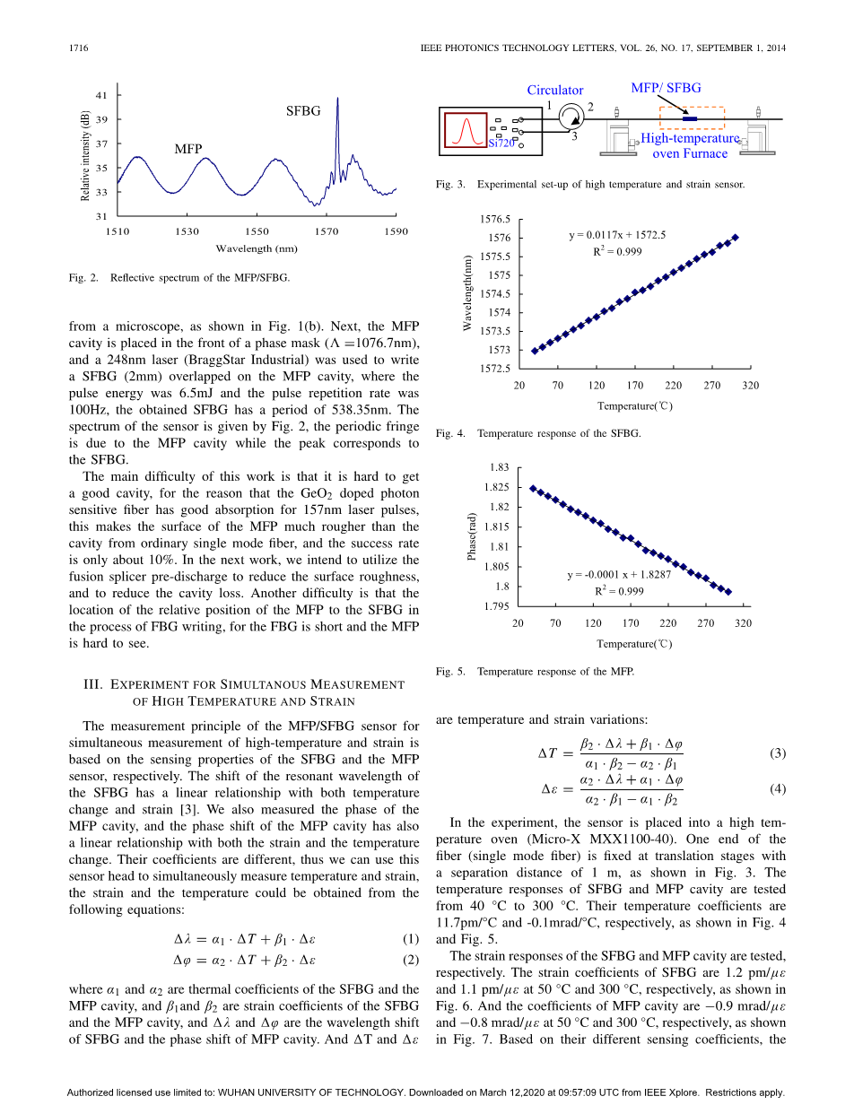 MFP/SFBG传感器的高温/应变同时测量实验的测量原理分别基于SFBG和MFP传感器的传感特性。SFBG谐振波长的漂移与温度变化和应变呈线性关系。我们也测量了MFP谐振腔的相位,MFP谐振腔的相移同样与应变和温度变化呈线性关系。他们的灵敏地系数是不一样的,因此我们可以利用传感头去同时测量温度和应变,应变和温度变化由以下方程组得到: