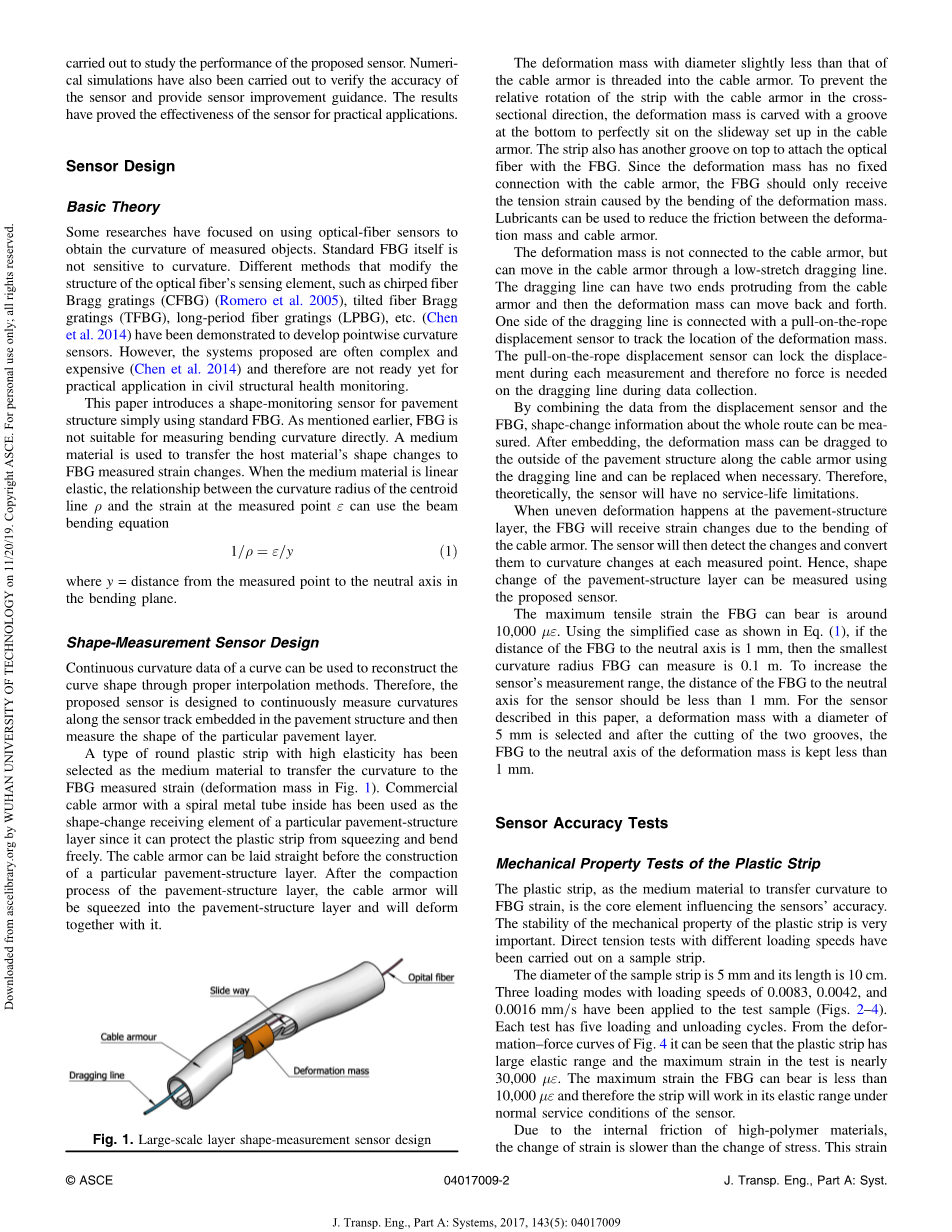 基于光纤的传感器具有体积小,精度高,成本低,分布范围广,耐用性强等优点,使其成为长期路面健康监测的理想选择(Zhou et al.2012) ; Liu等人2015; Zhou等人2010)。光纤布拉格光栅(FBG)是一种典型的基于光纤的传感技术。单模光纤的光栅是通过将纤芯的侧面横向暴露在强紫外光的周期性模式下制成的.FBG可以通过检测光纤中传输的布拉格波长的变化来测量应变和温度变化(Rao 1999)。低成本和几乎绝对的测量是基于FBG的传感器的显着特性。由于FBG只能精确地测量光栅位置处的应变,因此当前用于路面结构的所有基于FBG的传感器几乎都是点向应变传感器。